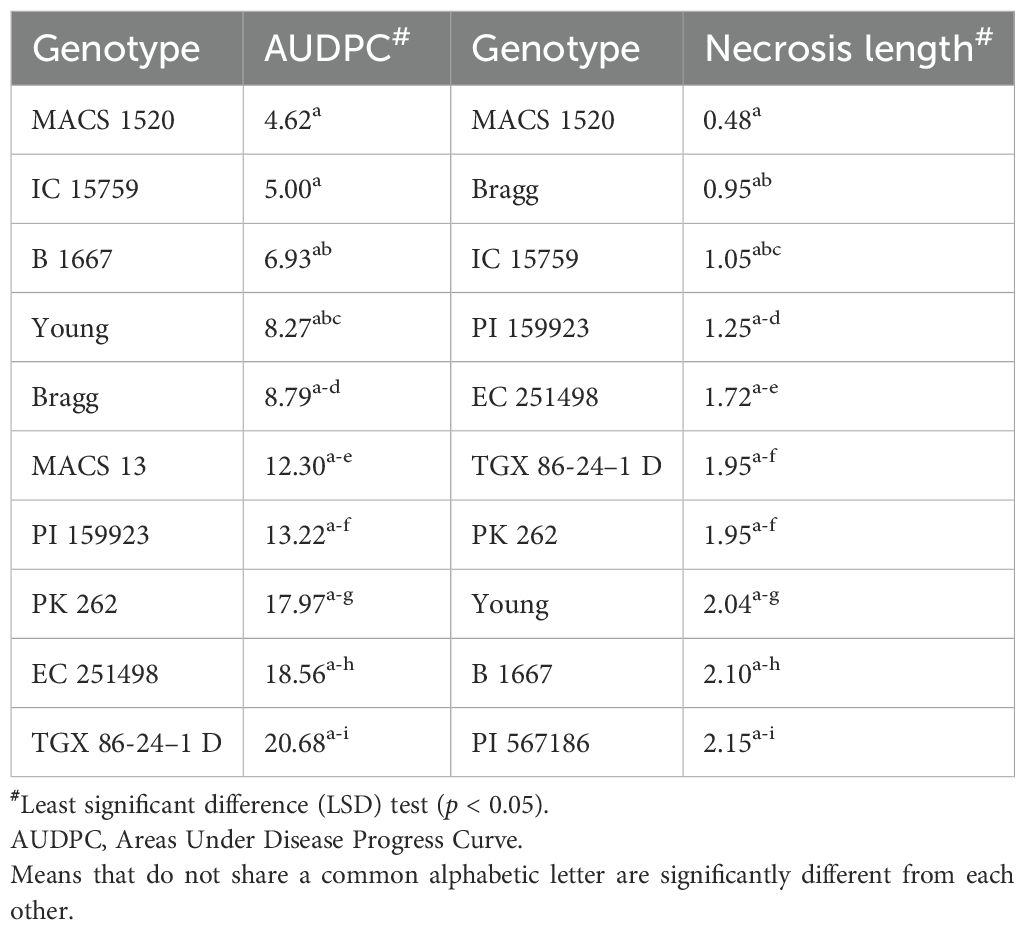 Table 1. Analysis of variance for the area under disease progress curve and necrosis length under the artificial inoculation experiment.