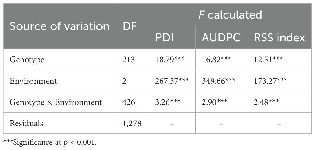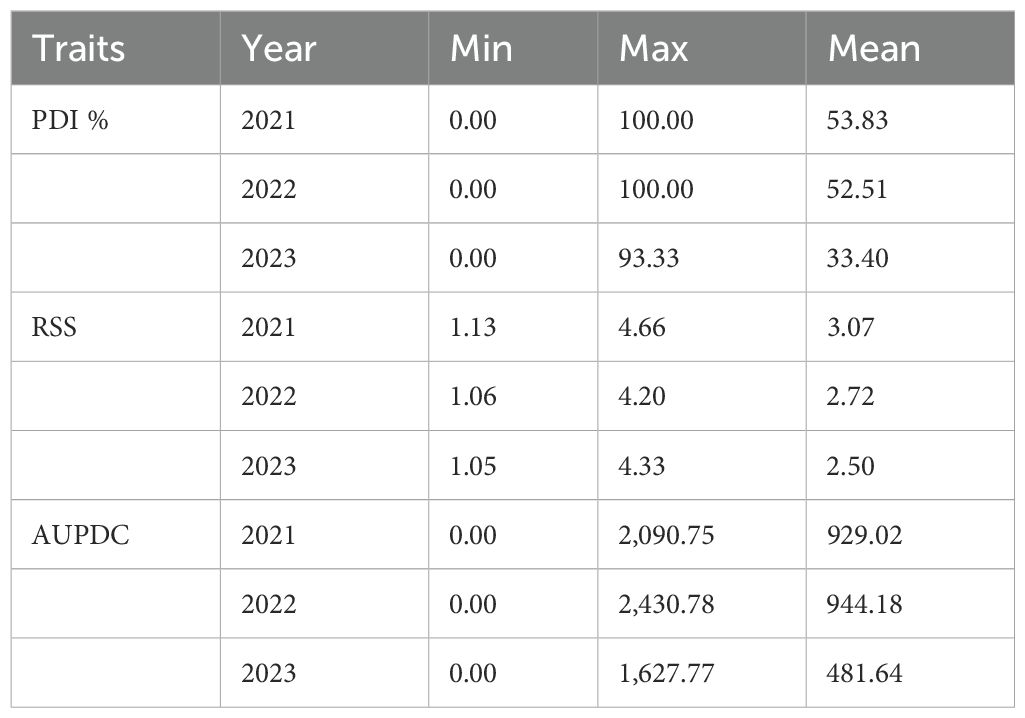 Across 3 years, the two checks (JS 95–60 and JS 93-05) showed susceptible disease reaction, indicating sufficient and uniform disease pressure in the sick plot. Pooled ANOVA revealed a significant genotype and environment effect and a significant genotype × environment interaction (p < 0.0001) (Table 3). The mean PDI was 53.83, 52.51, and 33.40 during 2021, 2022, and 2023, respectively (Table 4).
