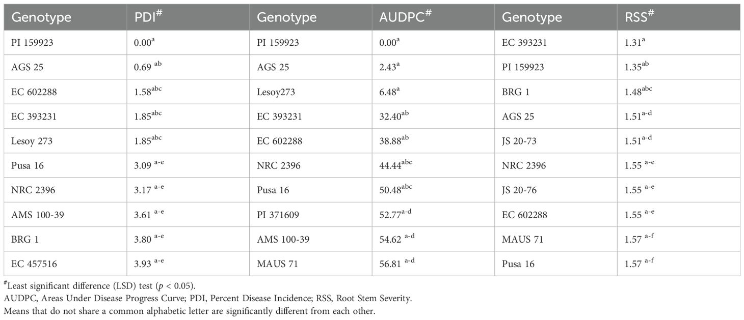 The identification of potential resistance donors is crucial in any disease resistance breeding program. The soybean introduction, PI 159923, was found to be resistant under both field and glasshouse conditions, and such genotypes are of immense importance in deploying charcoal rot resistance in cultivars. Furthermore, this genotype was previously reported to be resistant against purple seed stain (Alloatti et al., 2015) and high SMR (stem reserve mobilization) (Satpute et al., 2020). The genotype AGS 25 identified in the current study was previously reported to carry long juvenility (Gupta et al., 2021) and such genotypes would aid in the development of wider adaptable charcoal rot-resistant genotypes/varieties. In addition, charcoal rot-resistant genotypes JS 20–76 and EC 602288 were previously reported to be water logging tolerant (Chandra et al., 2023). These genotypes will be used in breeding for multiple stress-tolerant varieties.