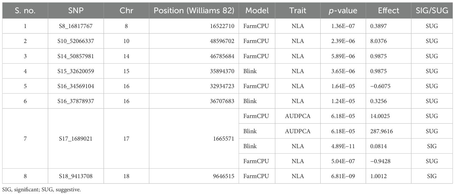 The analysis involved 214 diverse soybean germplasm accessions to study traits associated with charcoal rot resistance across 3 years (2021–2023). The association analysis was performed using two models—FarmCPU (Liu et al., 2016) and BLINK (Huang et al., 2019)—using the R package “GAPIT3” (Wang and Zhang, 2021). The first two principal components were included as covariates in both models. Significant SNPs were identified using an empirical significance threshold value of −Log10 p ≥ 4.0, equivalent to a p-value ≤ 0.0001, which has previously been reported to be appropriate for complex traits and has been used in previous studies (Chamarthi et al., 2021). Furthermore, to check false discovery rate (FDR), Bonferroni threshold was calculated by dividing probability level (0.05) with the total number of SNPs used, which yielded a cutoff of 7.46 e−7 (Gao et al., 2010). Those SNPs with the p-value above the cutoff were considered as “significant SNPs” while those below the cutoff were considered as “suggestive SNPs”. Manhattan plots illustrated significant markers, while quantile–quantile (Q–Q) plots compared expected versus observed p-value distributions (on a −log10 scale).