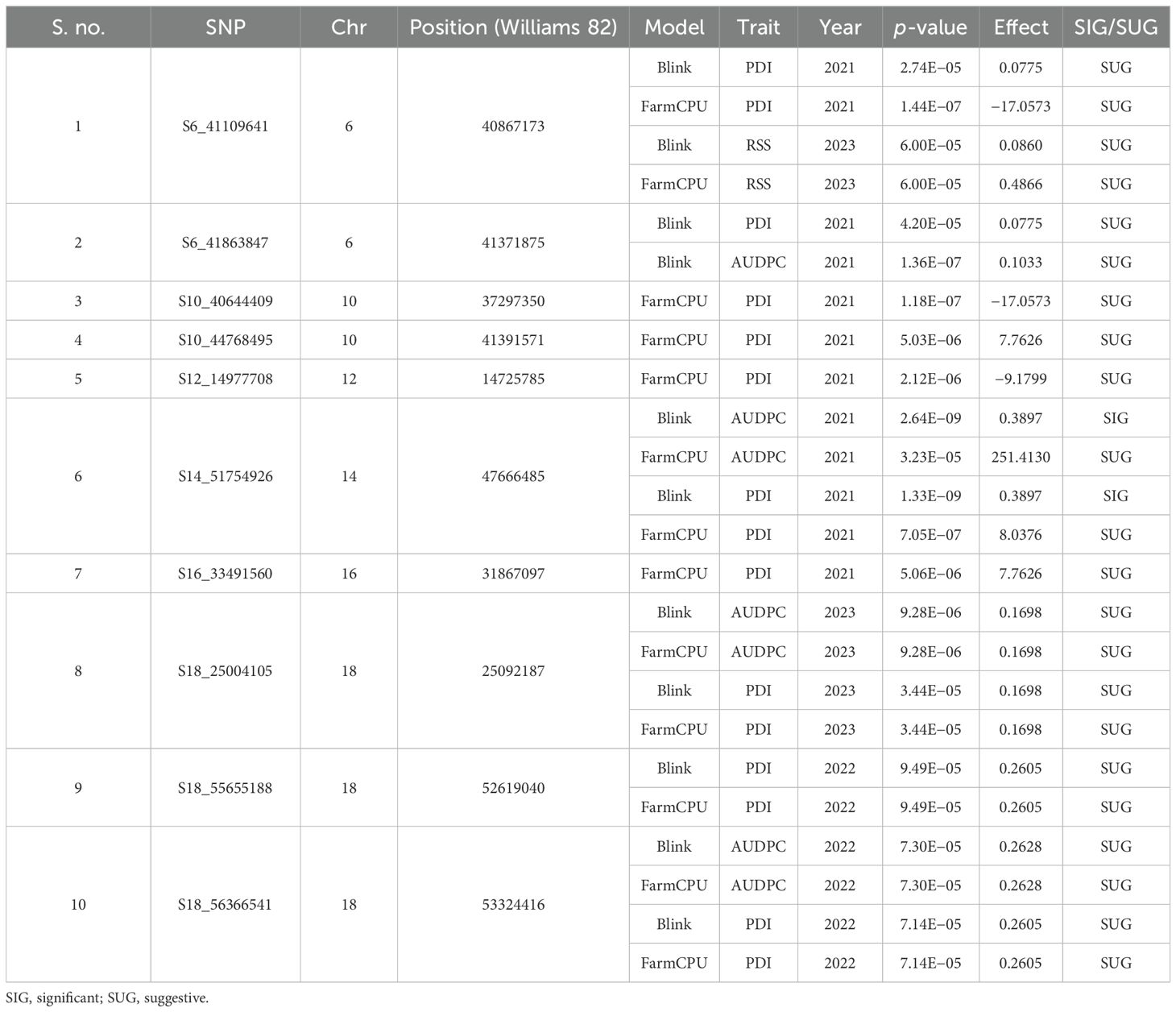Charcoal rot in soybean is a devastating disease that can be a threat to soybean production and sustainability. Nevertheless, very few studies have been carried out in identifying potential resistance donors and gene or loci governing the resistance. Screening for charcoal rot resistance is based on both field conditions (Coser et al., 2017; Amrate et al., 2023, 2024) and glasshouse conditions (Coser et al., 2017; Amrate et al., 2024). There are a few reports on the identification of loci governing soybean charcoal rot resistance through GWAS and bi-parental mapping (Coser et al., 2017; Silva et al., 2019; Vinholes et al., 2019 and Zatybekov et al., 2023). Previous reports are based on a glasshouse experiment and/or a single season field data. To our knowledge, this is the first report on GWAS on soybean charcoal rot resistance based on the evaluation of multiple field trials and under controlled conditions. Such studies will minimize the effect of disease escape in identifying the true associations. For example, in the current study, an SNP, S6_41109641, was found to be associated with charcoal rot resistance in 2021 and 2023 through both models.