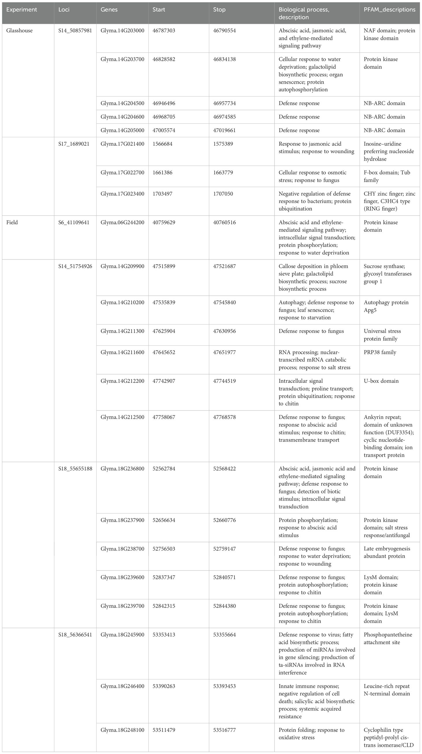 The putative candidate genes analysis was performed for six loci detected for multiple resistance traits. Within 400-kb genomic regions of these loci, a total of 23 genes with annotations associated with defense response pathway were identified (Table 8). Under glasshouse conditions, 5 genes (Glyma.14G203000, Glyma.14G203700, Glyma.14G204500, Glyma.14G204600, and Glyma.14G205000) were identified within the region of SNP S14_50857981, while 3 genes (Glyma.17G021400, Glyma.17G022700, and Glyma.17G023400) were identified within the region of S17_1689021, whereas under field conditions, 13 genes involved in defense response were identified. On chromosome 6, a putative candidate gene, Glyma.06G244200, was identified in the region of SNP S6_41109641. Six genes, Glyma.14G209900, Glyma.14G210200, Glyma.14G211300, Glyma.14G211600, Glyma.14G212200, and Glyma.14G212500, were identified on chromosome 14, near the peak SNP S14_51754926. Furthermore, on chromosome 18, five genes (Glyma.18G236800, Glyma.18G237900, Glyma.18G238700, Glyma.18G239600, and Glyma.18G239700) were identified within the region of S18_55655188 while three genes (Glyma.18G245900, Glyma.18G246400, and Glyma.18G248100) were identified near SNP S18_56366541. Details of the gene models and their biological functions are given in Table 8.