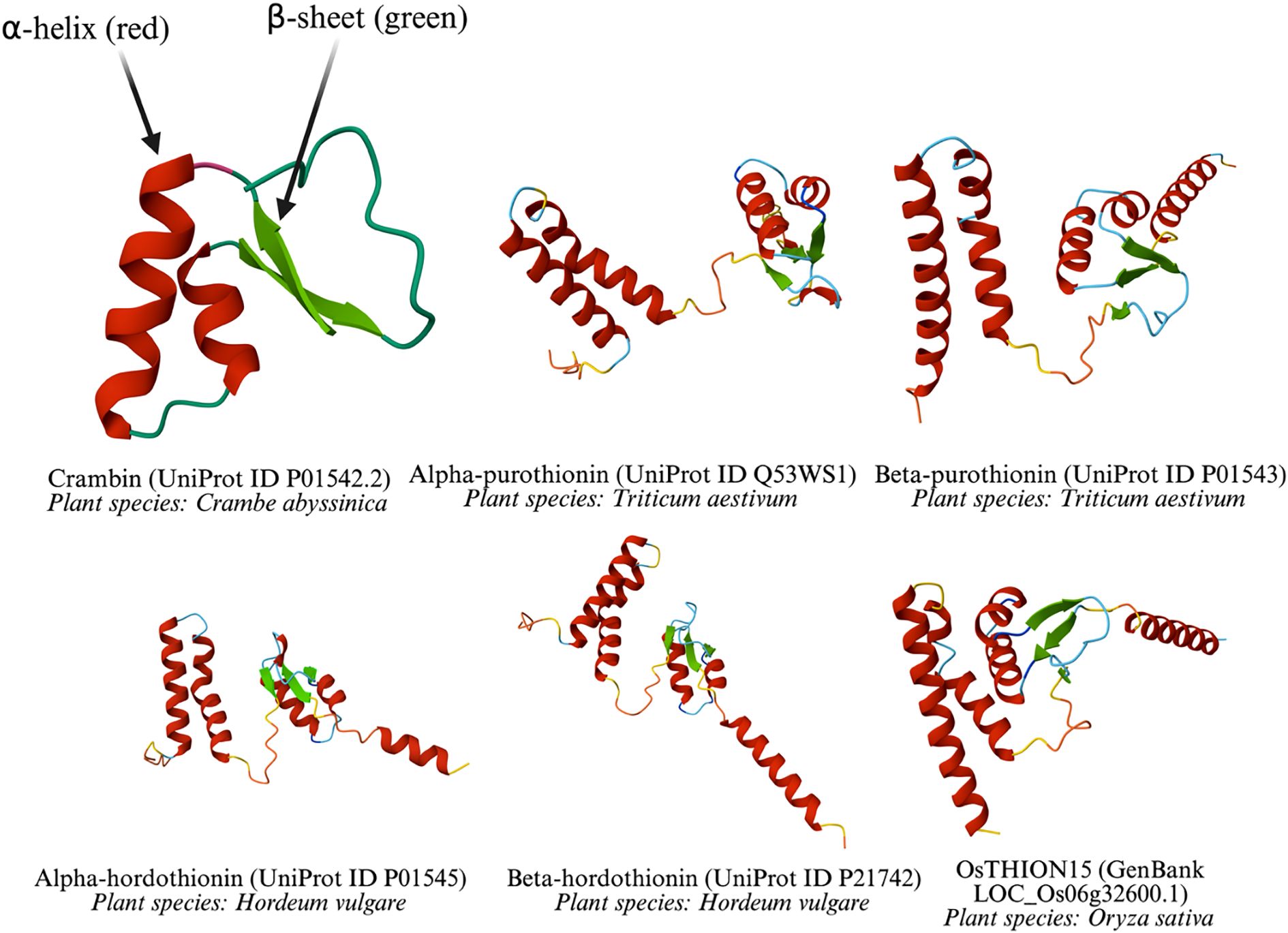 All depicted thionins share a common structural motif, including at least one α-helix and one β-sheet, which are critical for their antimicrobial function. These elements are stabilized by disulfide bonds, a hallmark of thionins, enabling them to disrupt microbial membranes. Differences in loop lengths and helix-sheet arrangements reflects species-specific variations, yet the conserved core structure underscores their shared evolutionary origin and functional role in plant defense. The diversity of plant species (Crambe abyssinica, Triticum aestivum, Hordeum vulgare, and Oryza sativa) highlights the widespread occurrence and adaptation of thionins across monocot and dicot plants.