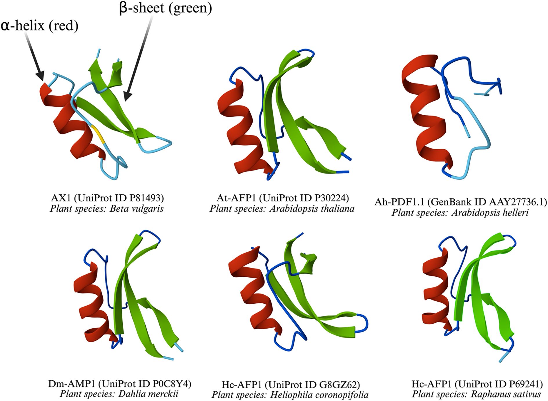 Thionins are a major class of plant-derived antimicrobial peptides (AMPs), alongside defensins, non-specific lipid transfer proteins, hevein-like peptides, knottin-like peptides, and cyclotides, distinguished by their cysteine spacing motifs and three-dimensional (3D) structures (Odintsova et al., 2018). As the first plant AMPs identified with in vitro antipathogenic activity, thionins are small peptides of approximately 5 kDa and 45–47 amino acids (aa), found predominantly in certain angiosperm families, including Poaceae (e.g., barley, wheat), Brassicaceae (e.g., Arabidopsis), and Ranunculaceae. Their compact structure, characterized by 6 or 8 cysteine residues forming 3 or 4 disulfide bridges, confers exceptional stability under diverse environmental conditions (Odintsova et al., 2018). Some common thionin structures were predicted using AlphaFold3 (Abramson et al., 2024) and are shown in Figure 1.