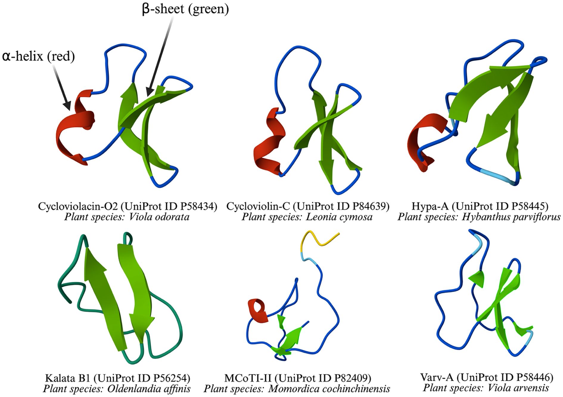 The figure illustrates the 3D-structures of six common cyclotides, which are characterized by one or more β-sheets, with and without α-helix. These representations highlight structural diversity across different plant species.