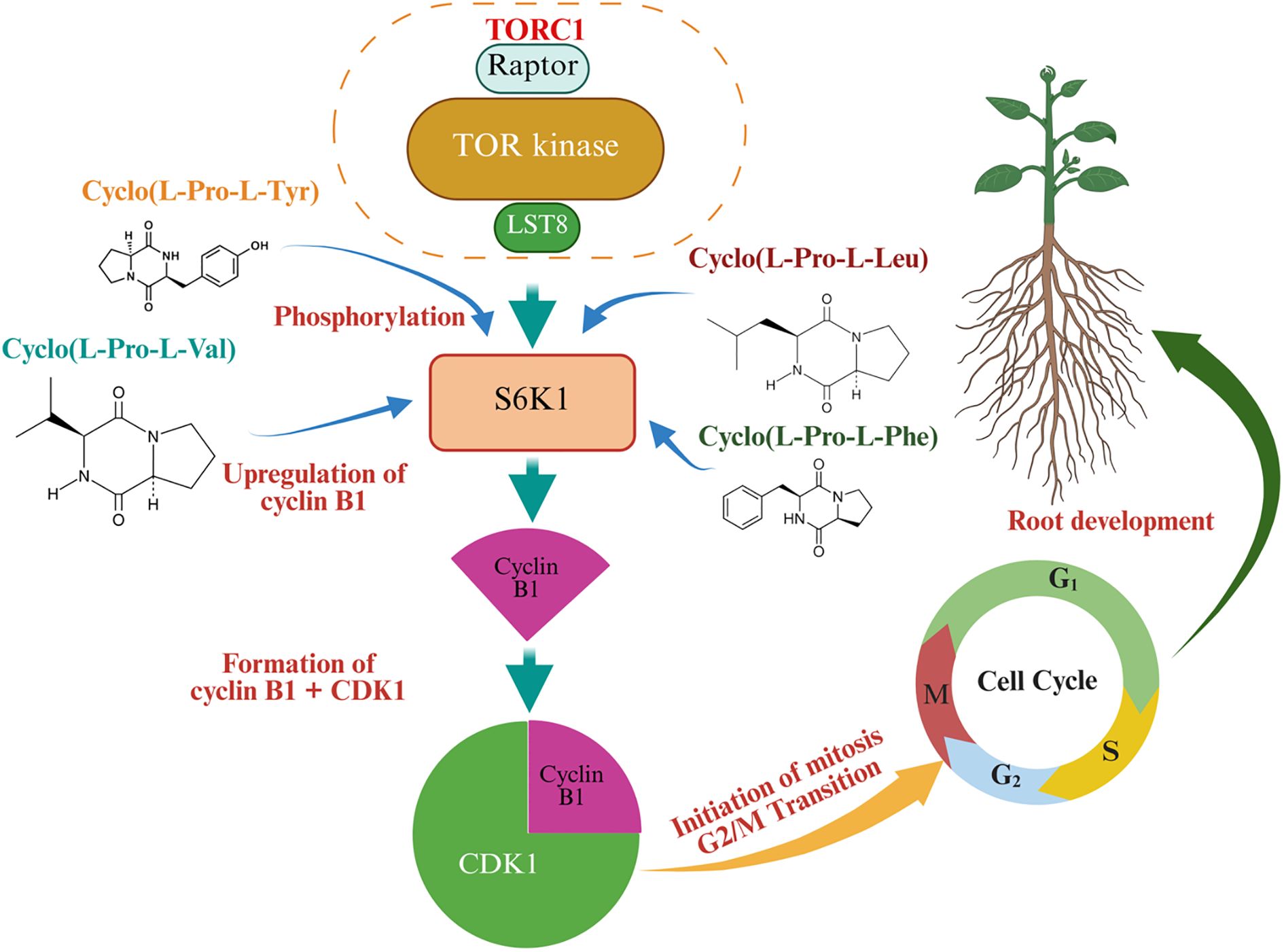 Figure 5 illustrates the molecular mechanisms involved in root development, with a focus on the Target of Rapamycin (TOR) signaling pathway. TOR kinase complex, consisting of TOR kinase, Raptor, and LST8, functions as the central regulator. The complex is induced by cyclic dipeptides [e.g., Cyclo(L-Pro-L-Tyr), Cyclo(L-Pro-L-Val), Cyclo(L-Pro-L-Leu), and Cyclo(L-Pro-L-Phe)], and subsequently facilitates the phosphorylation process to activate S6K1. S6K1 upregulates the expression of Cyclin B1, which leads to the formation of cyclin B1 and cyclin-dependent kinase 1 (CDK1). The Cyclin B1–CDK1 complex drives the transition from the G2 phase to the M phase (mitosis) in the cell cycle, thereby promoting root development in plants. Figure 5 was conceptualized based on the mechanisms described in (Caldana et al., 2019; González-López et al., 2021).