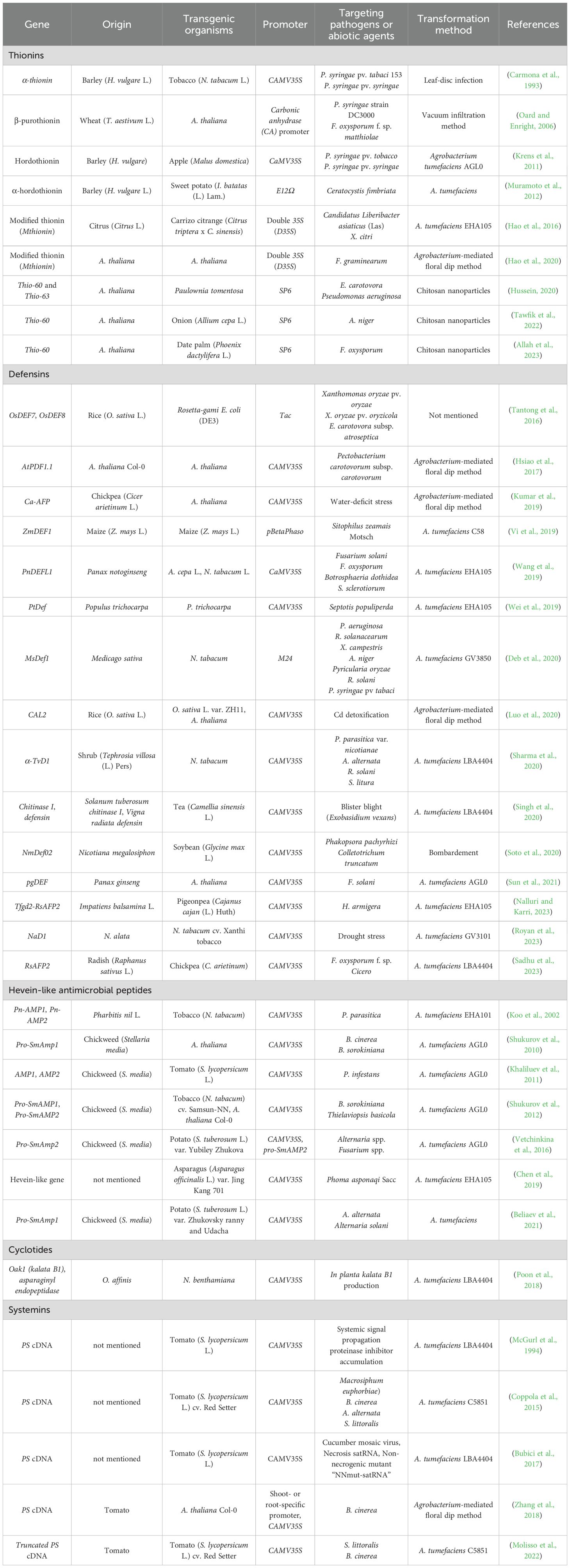 The genes encoding SYS and PS have been leveraged in transgenic plant development to enhance resistance to a range of biotic stresses, particularly against insects and fungal pathogens. Overexpression of the tomato PS gene in Arabidopsis conferred higher resistance to the necrotrophic fungus B. cinerea by modulating JA-responsive genes (Zhang et al., 2018). Further research on a truncated PS (tPS) cDNA, which lacks the SYS sequence, showed its remarkable effectiveness in two different host plants. In tomato, it resulted in reduced larval growth and higher mortality of the herbivorous insect S. littoralis and suppressed necrosis from B. cinerea (Molisso et al., 2022). A similar transformation in tobacco demonstrated that tPS enhances resistance to B. cinerea by upregulating a suite of defense genes, including heat shock proteins (HSP), glutathione S-transferases (GST), and proteinase inhibitor II (PI II) (Corrado et al., 2016). These findings show that both the full PS protein and its truncated version act as potent signaling molecules that fortify plant defenses through different pathways. Extending the theme of peptide-mediated signaling seen in SYSs, which amplify defense through JA pathways, cyclic dipeptides (CDPs) represent an even more compact and stable class of AMPs. These small molecules provide direct antimicrobial effects while also inducing resistance mechanisms, akin to those seen in hevein-like AMPs and SYSs. This dual functionality reinforces the interconnected roles of diverse AMPs in holistic plant stress management and transgenic innovation. Table 1 summarizes the application of SYS and PS genes, along with other AMP genes, in transgenic engineering strategies aimed at improving plant tolerance to both biotic and abiotic stresses.