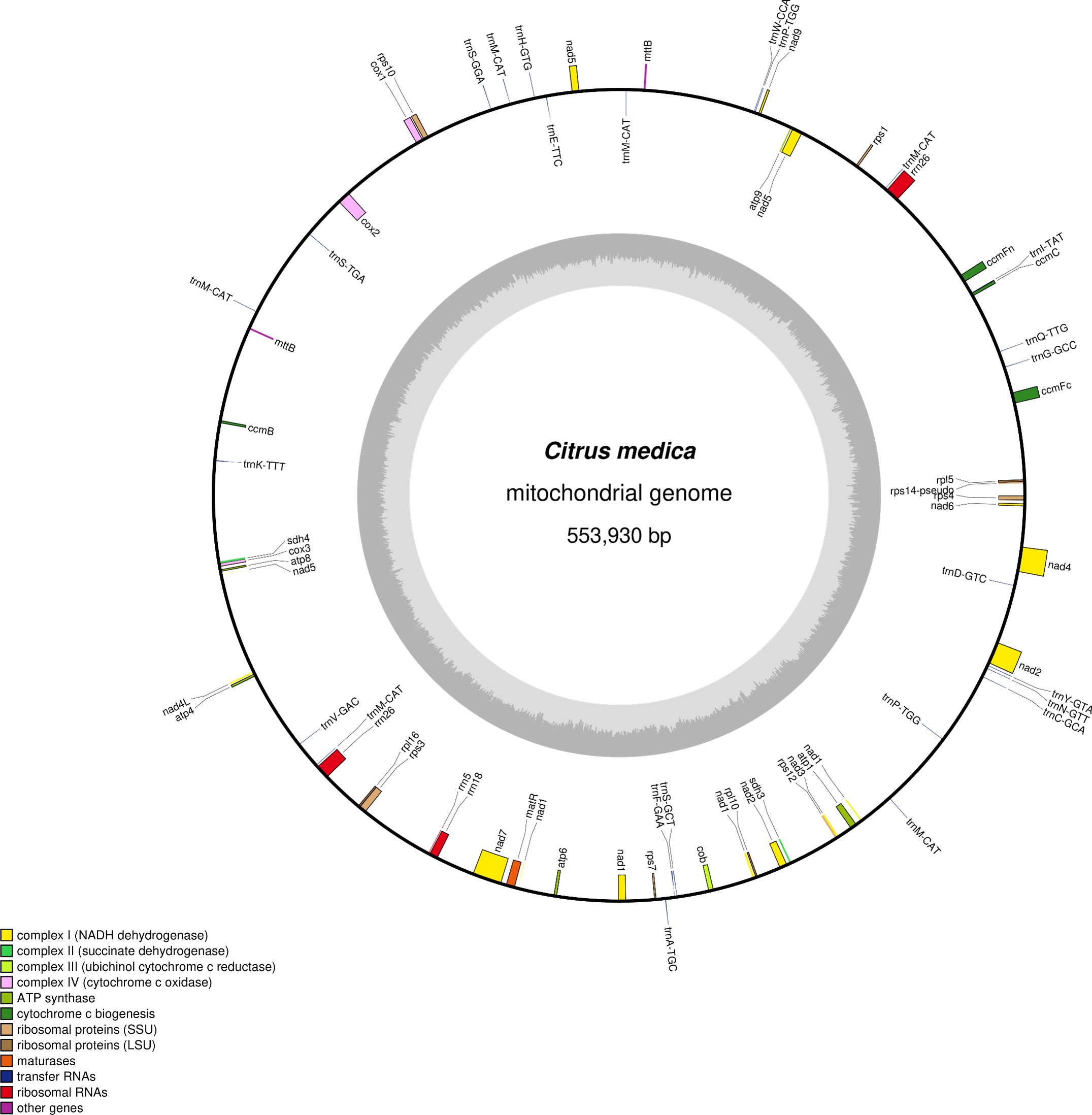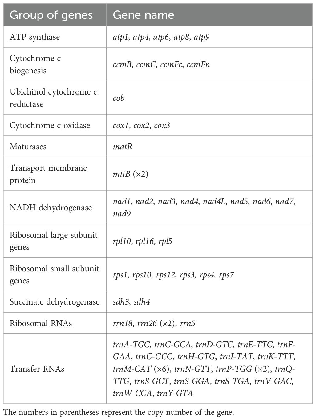 The mitochondrial genome of C. medica assembled in this study represents the first complete mitochondrial genomic resource for this ancestral Citrus species. Our hybrid sequencing strategy, which integrates long-read Nanopore and short-read Illumina data, successfully reveals a mitochondrial genome size of 553,930 bp, consistent with the expansive genome architecture typical of plant mitochondria. Annotation of the genome revealed 65 functional genes, including 36 PCGs, 25 tRNAs, and 4 rRNAs. This gene repertoire aligns with the conserved patterns observed in other angiosperm mitochondrial genomes, particularly the retention of 24 core PCGs (e.g., atp1, cox1-3, nad1-9) and convergent loss of ribosomal protein genes (rps/rpl) across land plants (Yu et al., 2018; Shen et al., 2022; Bi et al., 2023; Li et al., 2025).