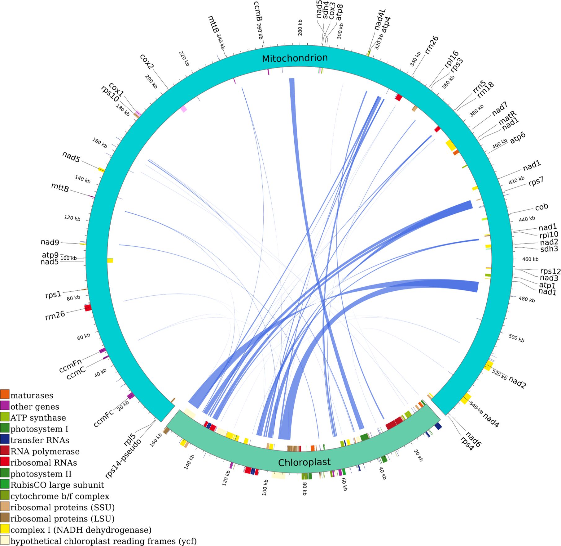 Figure 3. Homologous analysis based on mitochondrial and chloroplast genomes of C. medica. The homologous fragments are indicated using the blue lines.