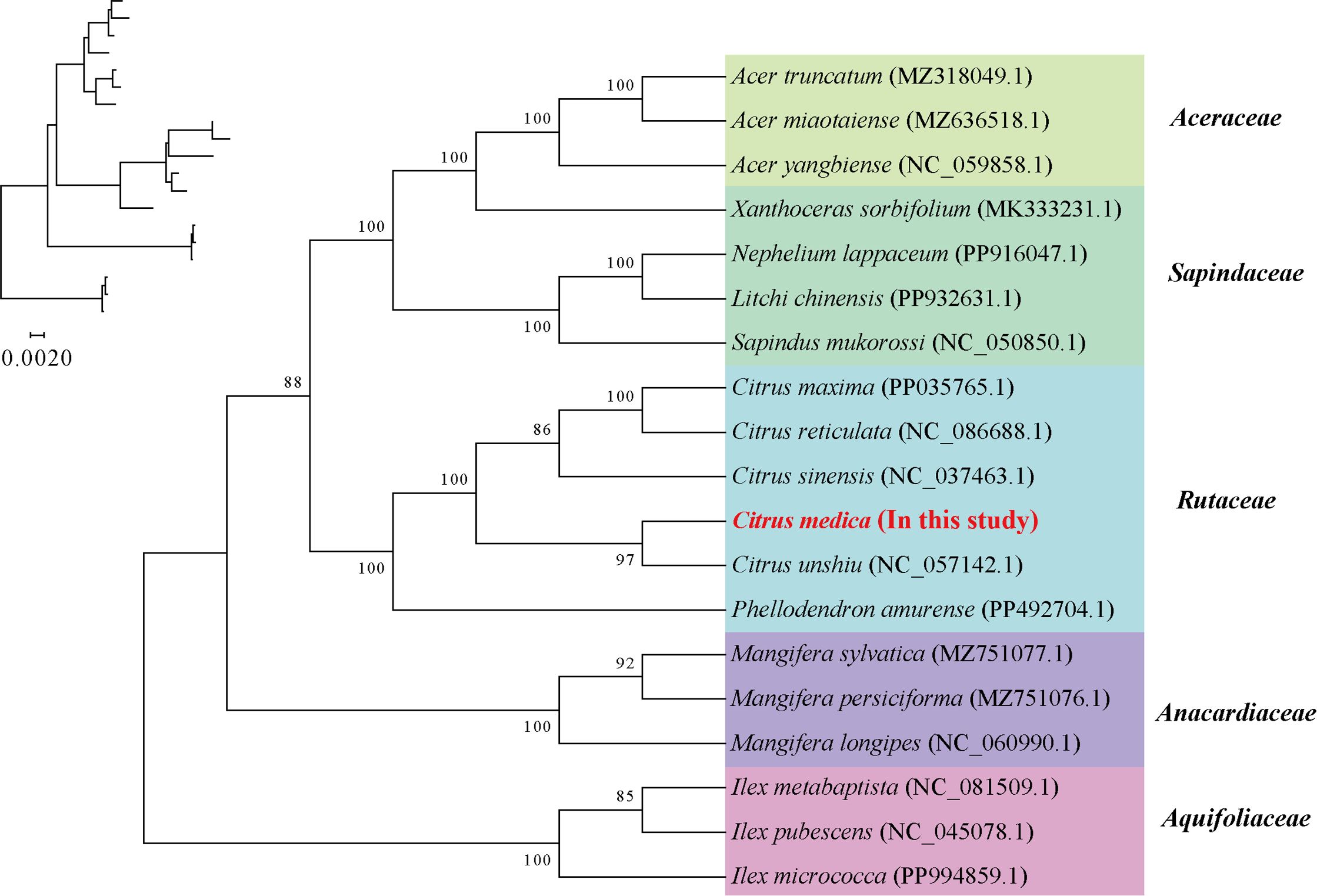 Nineteen complete mitochondrial genome sequences from two distinct orders (Sapindales and Aquifoliales) were obtained from the National Center for Biotechnology Information (NCBI) database, including those of C. sinensis (NC_037463.1), C. reticulata (NC_086688.1), C. maxima (PP035765.1), C. unshiu (NC_057142.1), Phellodendron amurense (PP492704.1, PP492705.1), Sapindus mukorossi (NC_050850.1), Litchi chinensis (PP932631.1), Nephelium lappaceum (PP916047.1), Xanthoceras sorbifolium (MK333231.1), Acer yangbiense (NC_059858.1), Acer miaotaiense (MZ636518.1), Acer truncatum (MZ318049.1), Mangifera longipes (NC_060990.1), Mangifera sylvatica (MZ751077.1), Mangifera persiciforma (MZ751076.1), Ilex micrococca (PP994859.1), Ilex metabaptista (NC_081509.1), and Ilex pubescens (NC_045078.1). Species from the genus Ilex (I. micrococca (PP994859.1), I. metabaptista (NC_081509.1), and I. pubescens (NC_045078.1)) were designated as the outgroup. Ilex species (order Aquifoliales) were chosen for this role because Aquifoliales belongs to the asterid clade, which—together with the rosid clade—constitutes the core Pentapetalae. Given that the ingroup taxa in this study (Sapindales) are classified within the rosids, this deep phylogenetic divergence between the asterid and rosid lineages ensures that Ilex provides a robust and evolutionarily distant root for resolving phylogenetic relationships within Sapindales. The mitochondrial genome of C. medica, obtained through sequencing and assembly in this research, was incorporated to construct a phylogenetic tree for in-depth phylogenetic analysis.