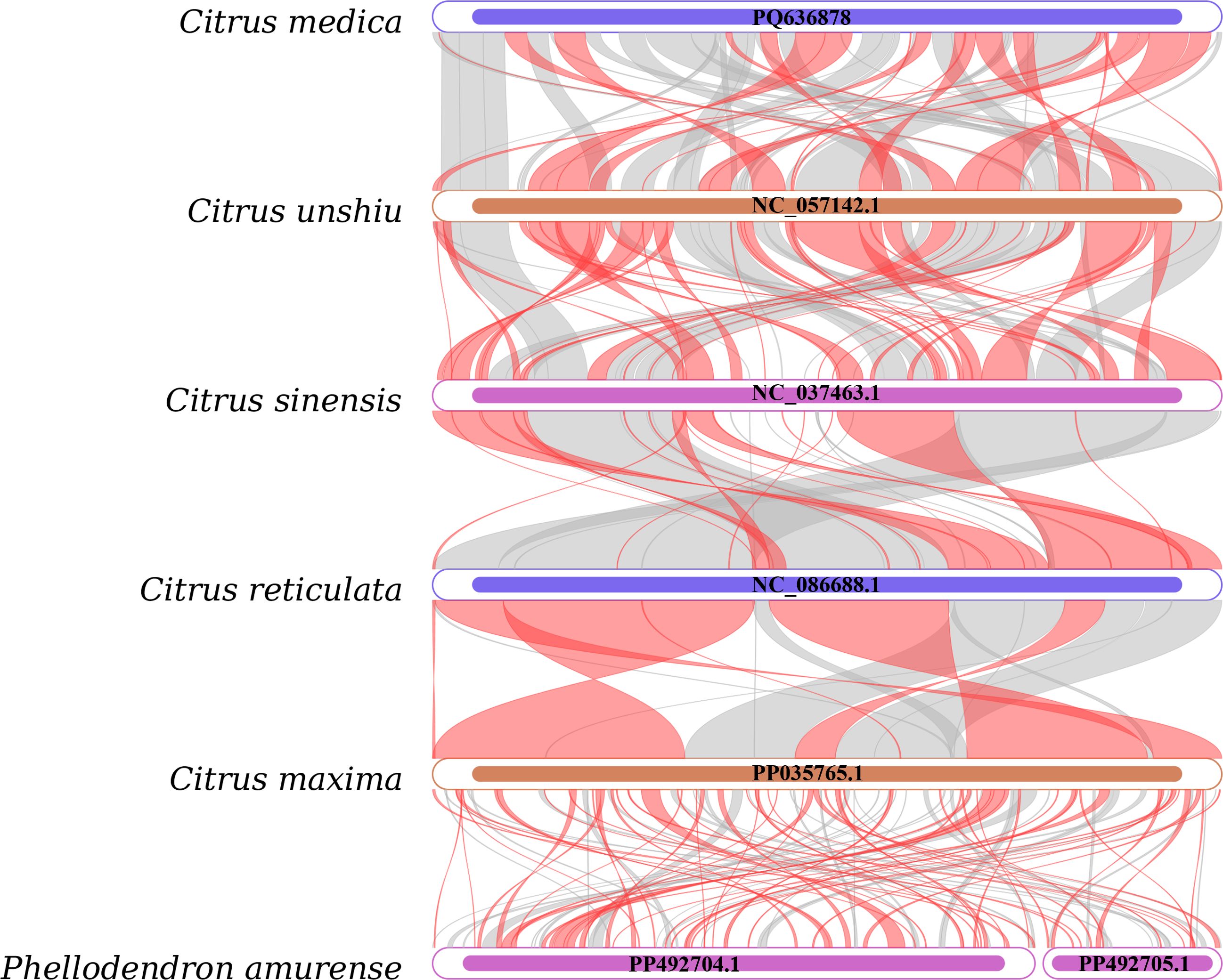 Figure 5. Collinear analysis of six Rutaceae species. Inverted regions (red arcs); homologous regions (gray arcs).