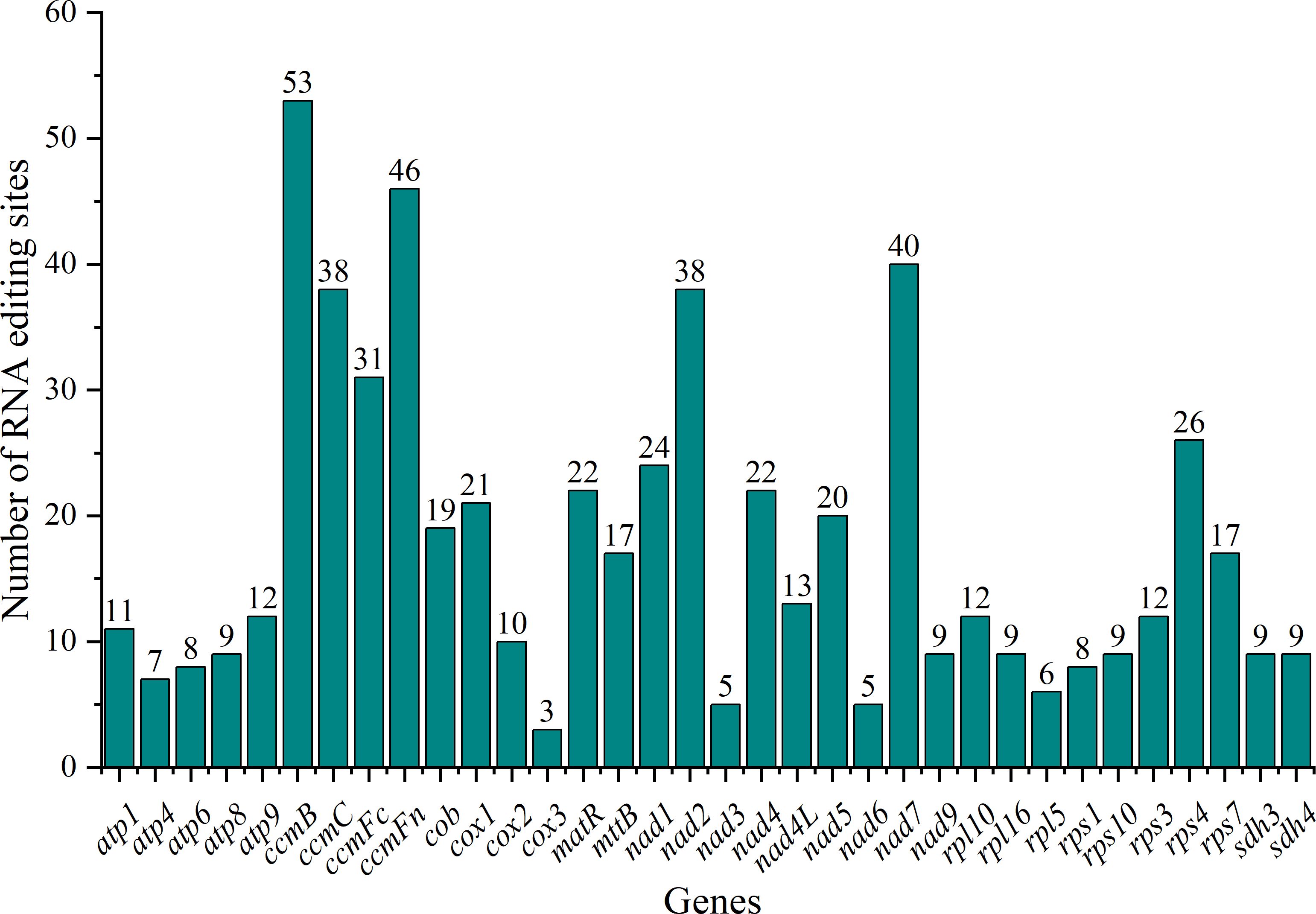 Figure 6. RNA editing sites in mitochondrial protein-coding genes (PCGs) of C. medica. The x-axis represents the name of the gene undergoing RNA editing. The y-axis represents the number of RNA editing sites.