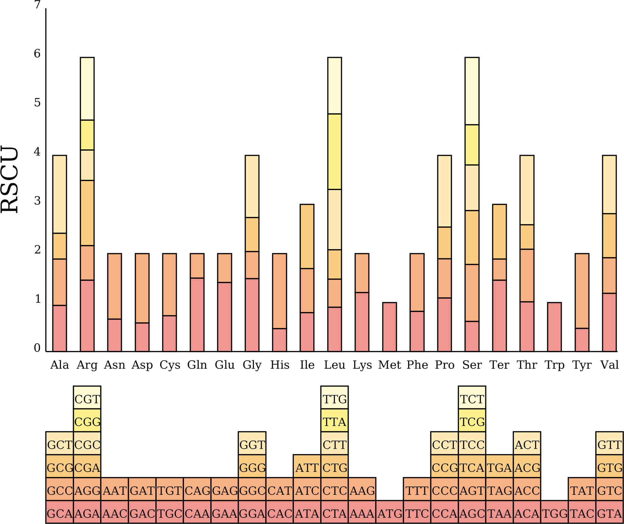 Figure 7. Codon usage bias in C. medica mitochondrial protein-coding genes (PCGs). RSCU values are represented on the y-axis, and the codons for the respective amino acids are represented on the x-axis.