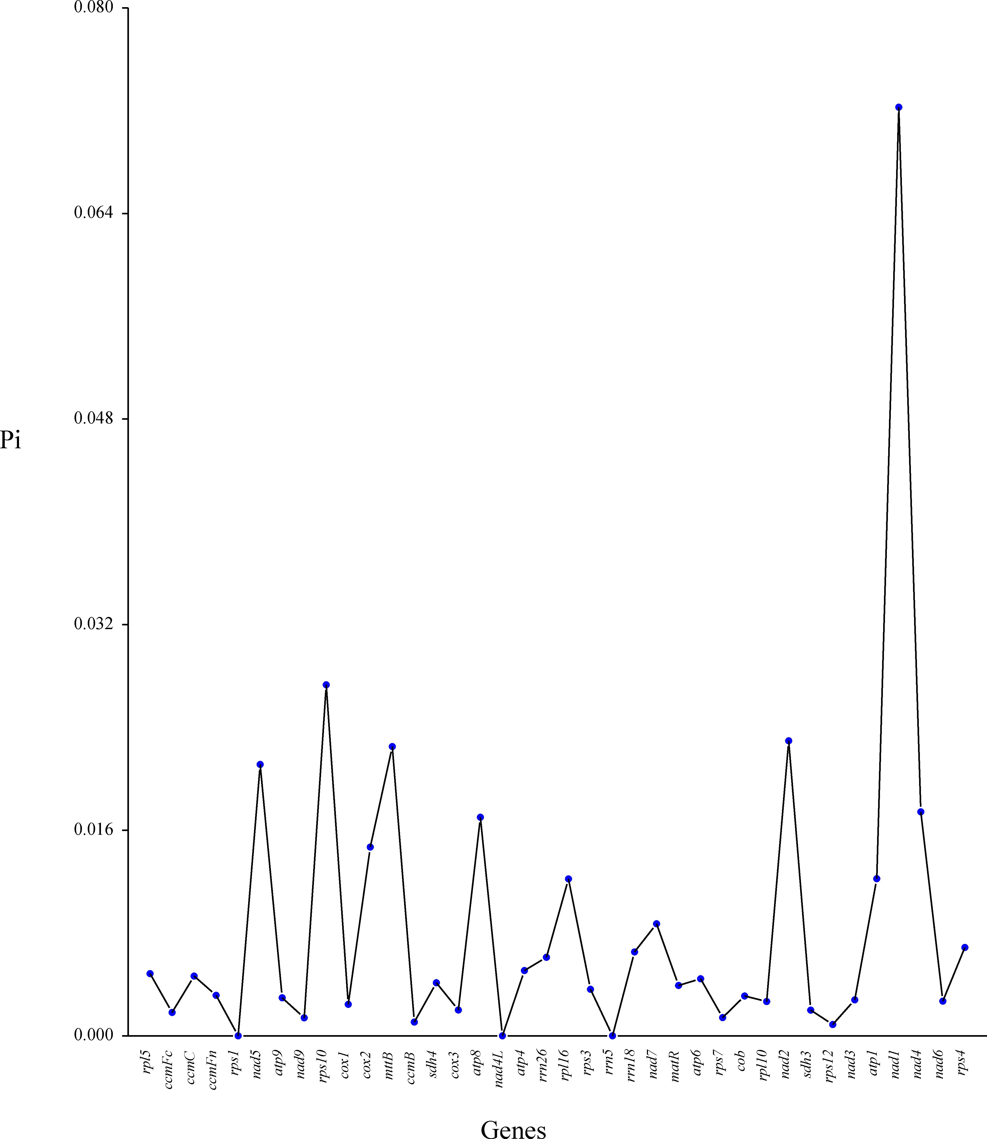 Figure 8. Nucleotide diversity (Pi) in the mitochondrial genome of C. medica. The x-axis represents mitochondrial genes, while the y-axis displays the corresponding Pi values for each gene.
