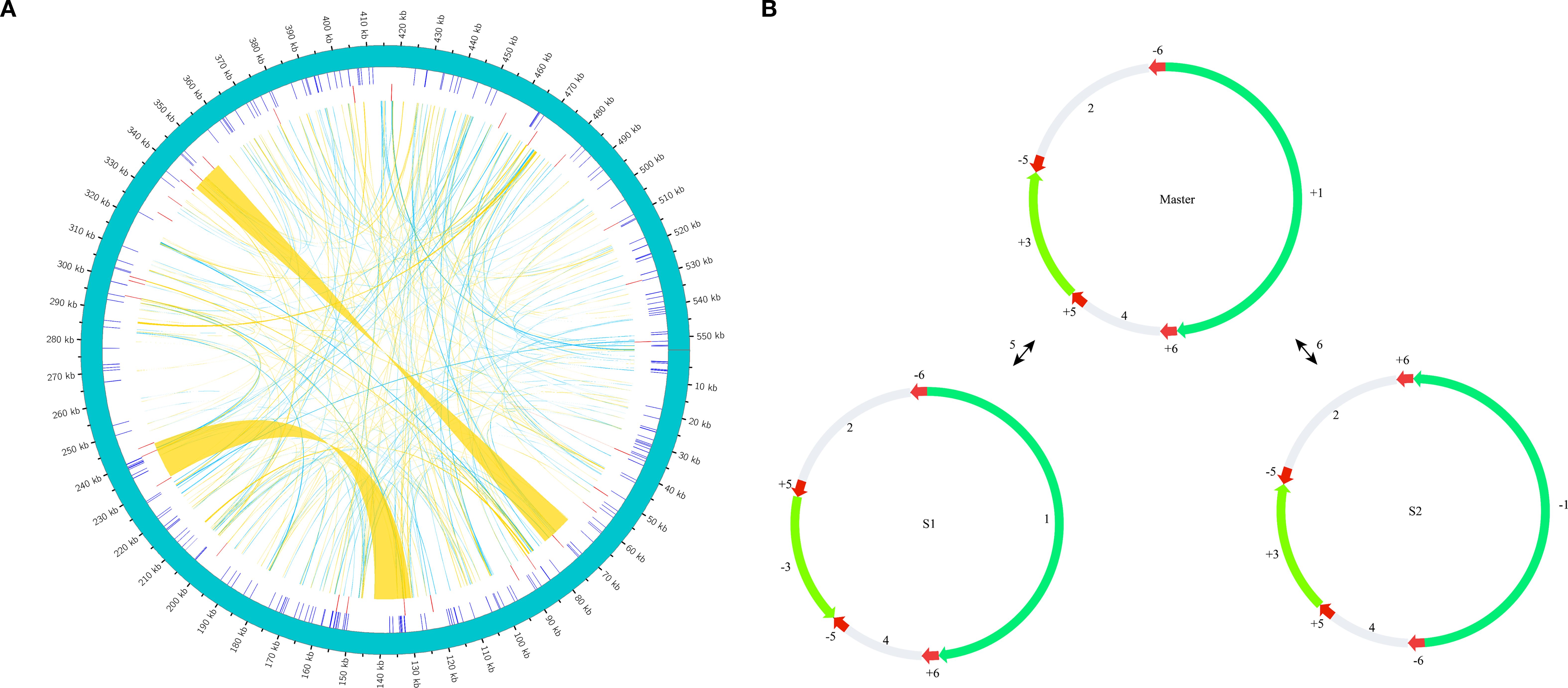 Figure 9. Repeat structures in the C. medica mitochondrial genome (A). Schematic representation of repeat elements: the green outer arc depicts the complete mitochondrial genome, inner blue ticks indicate simple sequence repeats (SSRs), red ticks represent tandem repeats, and connecting ribbons show dispersed repeats (A). Long direct repeat-mediated recombinational substructures, with red arrows marking the orientation and positions of repetitive sequences 5 and 6 involved in recombination events (B).