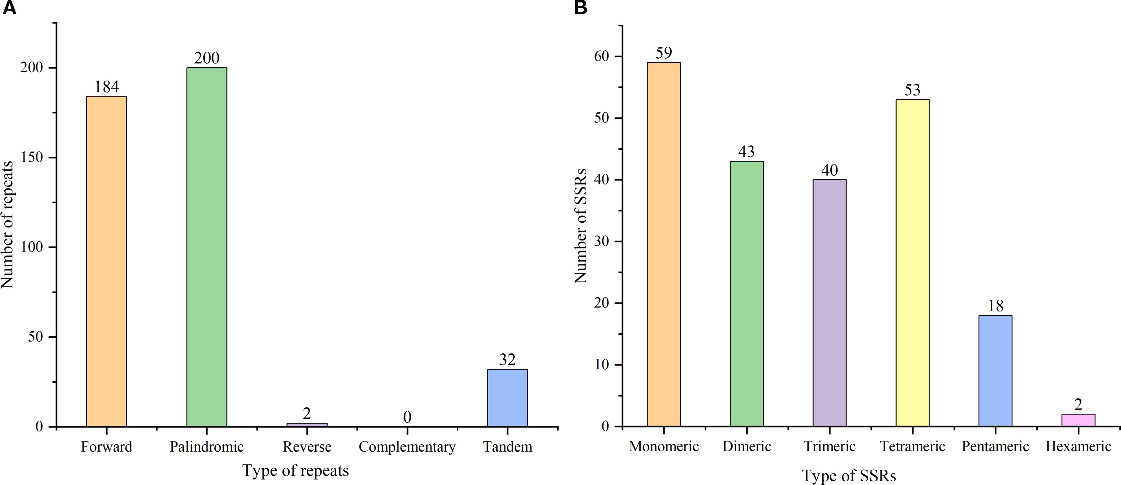 Our analysis identified 633 repetitive sequences within the C. medica mitochondrial genome, comprising 386 dispersed repeats, 215 SSRs, and 32 tandem repeats (Figure 9A). Notably, two long inverted complementary repeats (>1 kb) were detected (contigs 5 and 6 in Supplementary Figure S1), which may facilitate the formation of two distinct substructures (Figure 9B). Among the 386 dispersed repeats (>30 bp), 200 pairs were palindromic, 184 displayed forward orientation, and two were reverse, with none exhibiting complementary repeats (Figure 10A; Supplementary Table S6). The palindromic repeats included exceptionally long fragments (11,189 bp and 13,039 bp), while the longest forward repeat spanned 296 bp; reverse repeats measured 30–31 bp. Characterization of the 215 SSRs revealed the following distribution: 59 monomeric (27.44%), 43 dimeric (20.00%), 40 trimeric (18.60%), 53 tetrameric (24.65%), 18 pentameric (8.37%), and two hexameric (0.93%) (Figure 10B). Further analysis showed that 94.92% (56/59) of monomeric SSRs were A/T-rich, while 58.14% (25/43) of dimeric SSRs contained AG/CT motifs (Supplementary Figure S5). Additionally, 32 tandem repeats exhibited >71% sequence identity, with lengths ranging from 5 to 40 bp and copy numbers varying from 2 to 5 (Supplementary Table S7).
