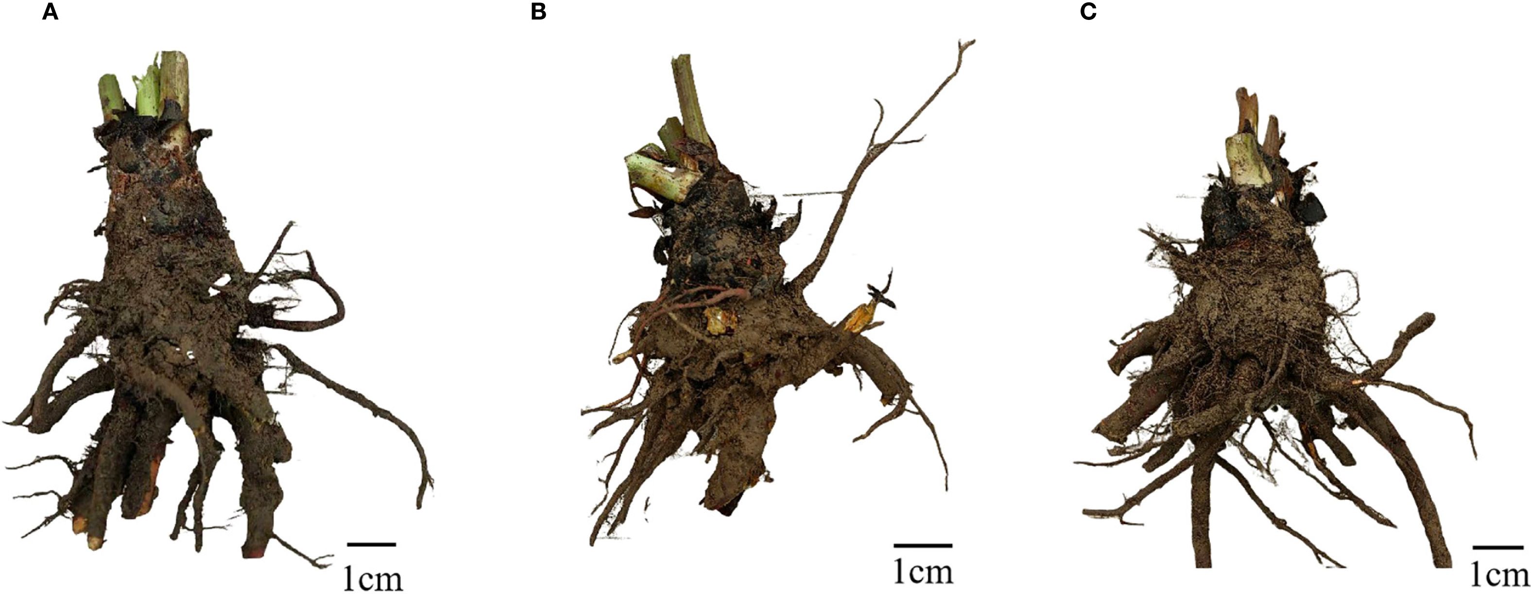 For soil sampling, the soil adhering to the roots of R. officinal was collected by gentle shaking, and rhizosphere soil samples tightly bound to the fibrous roots were carefully collected using sterilized brushes (Supplementary Figure S2). The frozen soil samples were dispatched to Shanghai Paisno Biotechnology Co., Ltd. for the detection of microbial diversity. Meanwhile, the remaining soil samples were air-dried to remove impurities, passed through a 20-mesh sieve, and then subjected to the determination of soil physical and chemical properties.