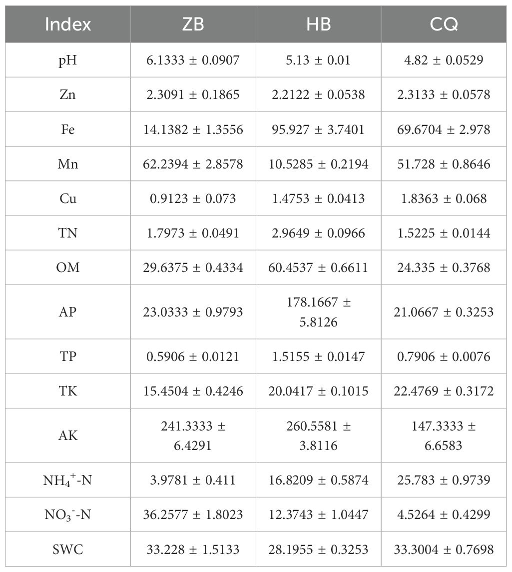 Significant regional variations in soil physicochemical properties were observed among the three study areas (Table 1). Soil pH analysis revealed neutral conditions in ZB (pH 6.5-7.5), while HB and CQ exhibited acidic soils (pH 4.5-5.5). Trace element analysis demonstrated distinct distributions patterns: iron (Fe) concentrations were markedly elevated in HB (6.78 × ZB, 1.38 × CQ; p<0.01), whereas ZB showed the highest manganese (Mn) levels (5.91× HB, 1.20× CQ; p<0.01). CQ soils contained significantly greater Copper (Cu) (2.01 × ZB, 1.24 × HB; p<0.05), while Zinc (Zn) showed no significant interregional differences. Nutrient analysis revealed HB’s superior fertility, with significantly higher concentrations of total nitrogen (TN: 1.65 × ZB, 1.95 × CQ), organic matter (OM: 2.04 × ZB, 2.48 × CQ), available phosphorus (AP: 7.74 × ZB, 8.46 × CQ), and total phosphorus (TP: 2.57 × ZB, 1.92 × CQ; all p<0.01). CQ exhibited the highest total potassium (TK: 1.45 × ZB, 1.12 × HB; p<0.05) and ammonium nitrogen (NH4+-N: 6.48 × ZB, 1.53 × HB; p<0.01). ZB showed predominant nitrate nitrogen (NO3--N: 2.93 × HB, 8.01 × CQ; p<0.01), while water-soluble content (SWC) was significantly lower in HB compared to other region.