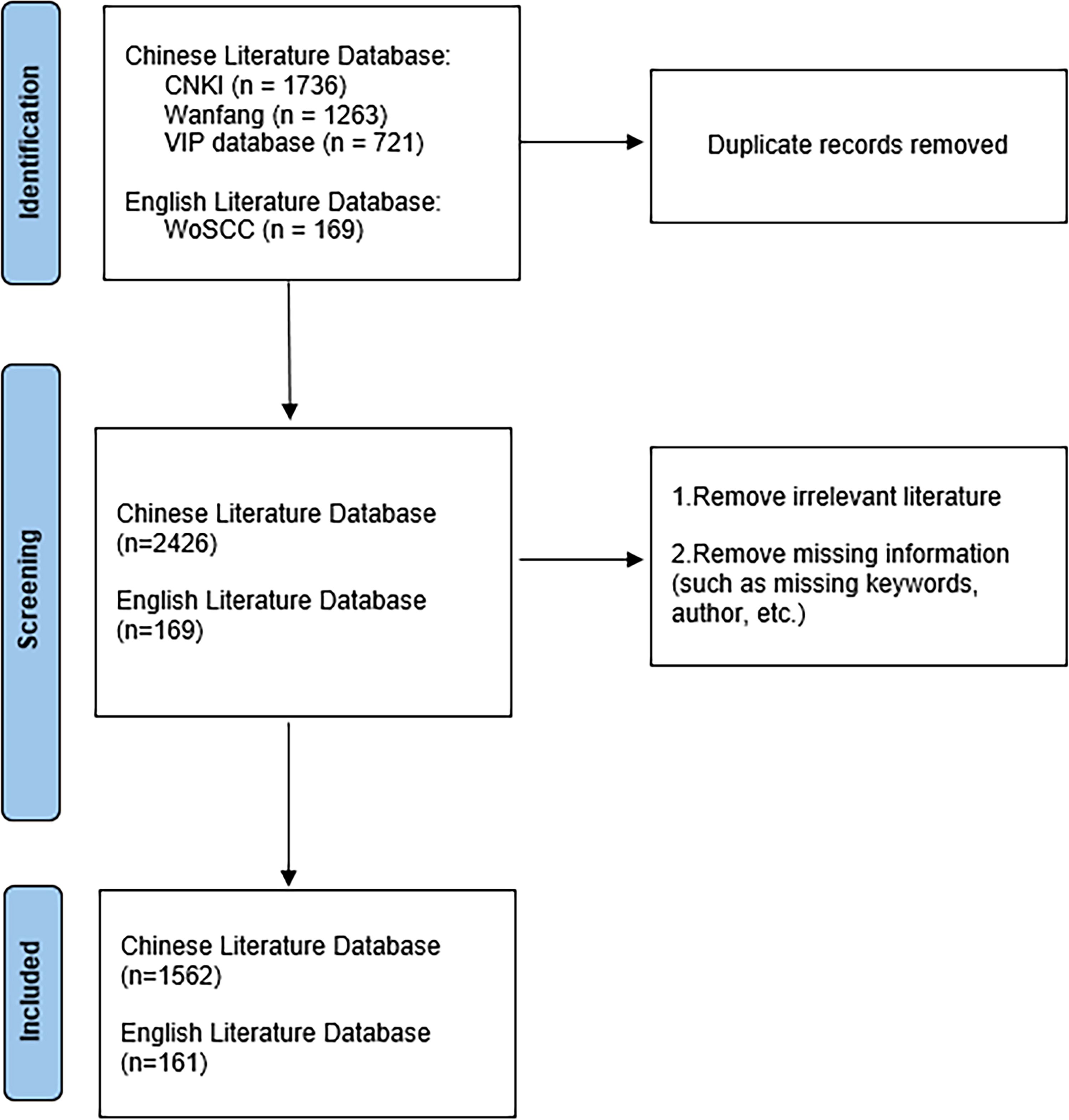 A search formula was employed for article acquisition, and 3124 documents were retrieved in this study, including 2951 in Chinese and 173 in English. A total of 1736 articles were obtained from the CNKI database, 1263 results were retrieved from the Wanfang database, 721 results were retrieved from the VIP database, and 169 results were retrieved from the WoSCC database. Based on the exclusion criteria, a total of 1401 duplicate articles were eliminated, resulting in the inclusion of 1562 articles (90.7%) in Chinese and 161 articles (9.3%) in English, culminating in a total of 1723 articles.
