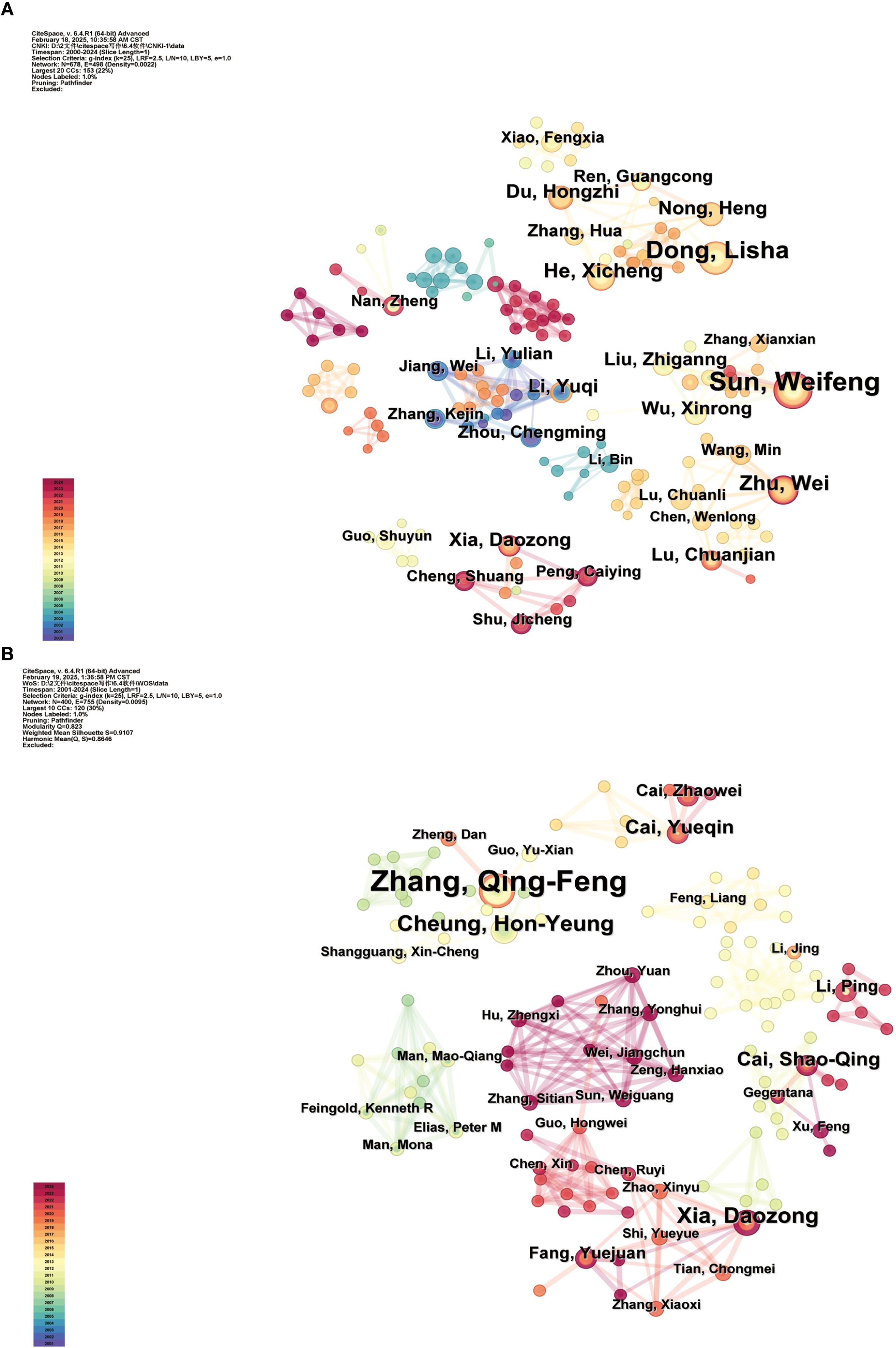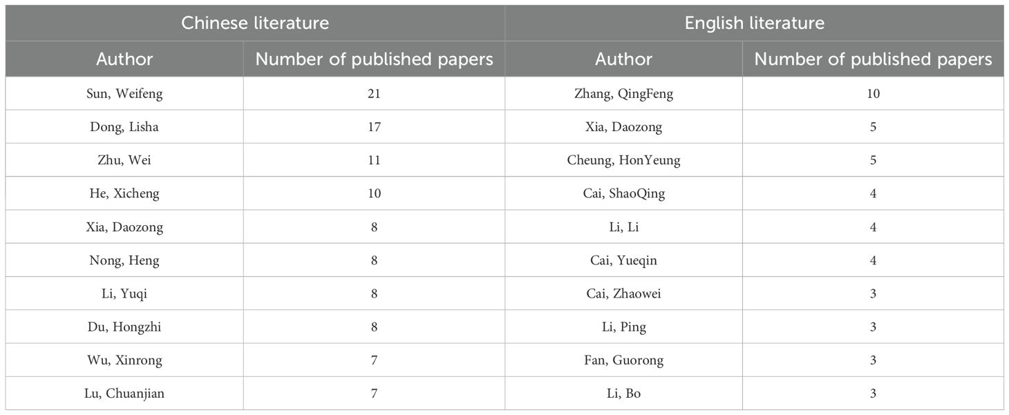 This study analyzed the authors of the literature Chinese literature produced 678 nodes and 498 connections, yielding a network density of 0.0022. Conversely, the English literature generated 400 nodes and 755 connections, resulting in a network density of 0.0095. Figures 3A, 3B depict the co-occurrence maps of the authors in the Chinese and English literature, respectively. In these maps, nodes symbolize authors, with node size denoting the quantity of publications by the authors. Lines illustrate collaborative relationships between authors, and the thickness of the lines reflects the degree of cooperation among them (Chen, 2006; Mokhnacheva and Tsvetkova, 2020). Table 1 presents the ten foremost authors. The authors with the most publications in Chinese literature are Sun, Weifeng (21 papers), Dong, Lisha (17 papers), and Zhu, Wei (11 papers). The prominent authors in English literature comprise Zhang, QingFeng (10 articles), Xia, Daozong (5 articles), and Cheung, HonYeung (5 articles), among others.