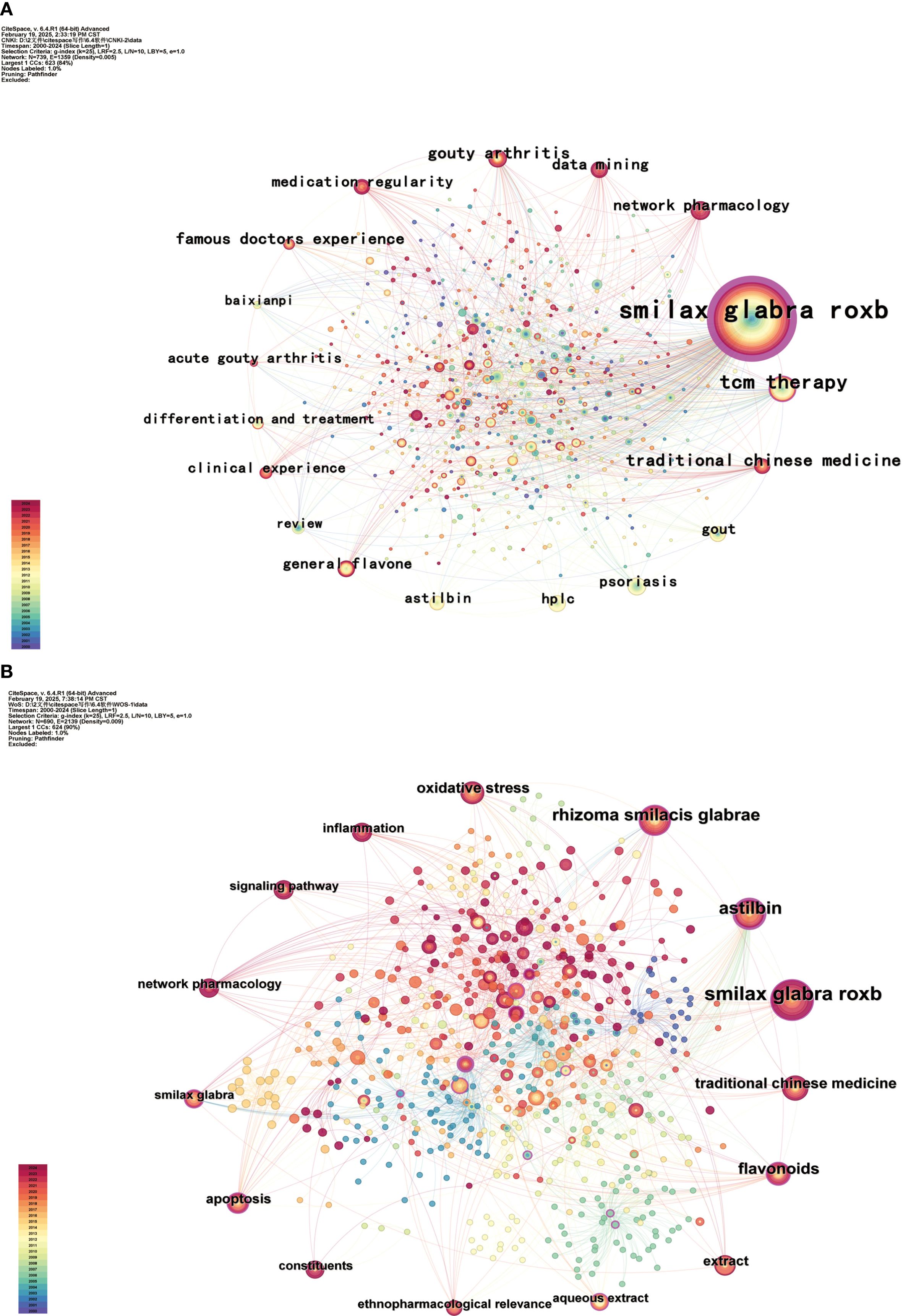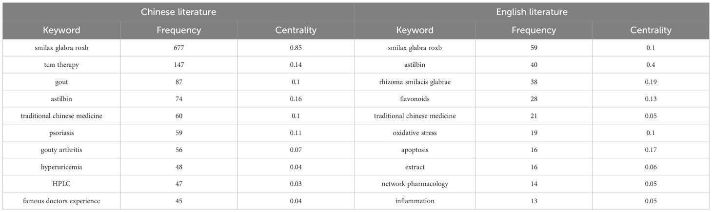 Analyzed the co-occurrence of keywords pertaining to TCM and SGR, yielding a keyword co-occurrence map with 739 nodes, 1,359 connections, and a density of 0.005. The keyword co-occurrence map of keywords in English literature, comprising 690 nodes, 2,139 connections, and a density of 0.009, is illustrated in Figures 6A, 6B. Table 3 illustrates that the predominant keywords in the Chinese literature are SGR (677 occurrences), TCM therapy (147 occurrences), gout (87 occurrences), astilbin (74 occurrences), and TCM (60 occurrences). Conversely, the high-frequency keywords in the English literature are SGR. (59 occurrences), astilbin (40 occurrences), rhizoma smilacis glabrae (38 occurrences), flavonoids (28 occurrences), and TCM (21 occurrences), as outlined in Table 4.