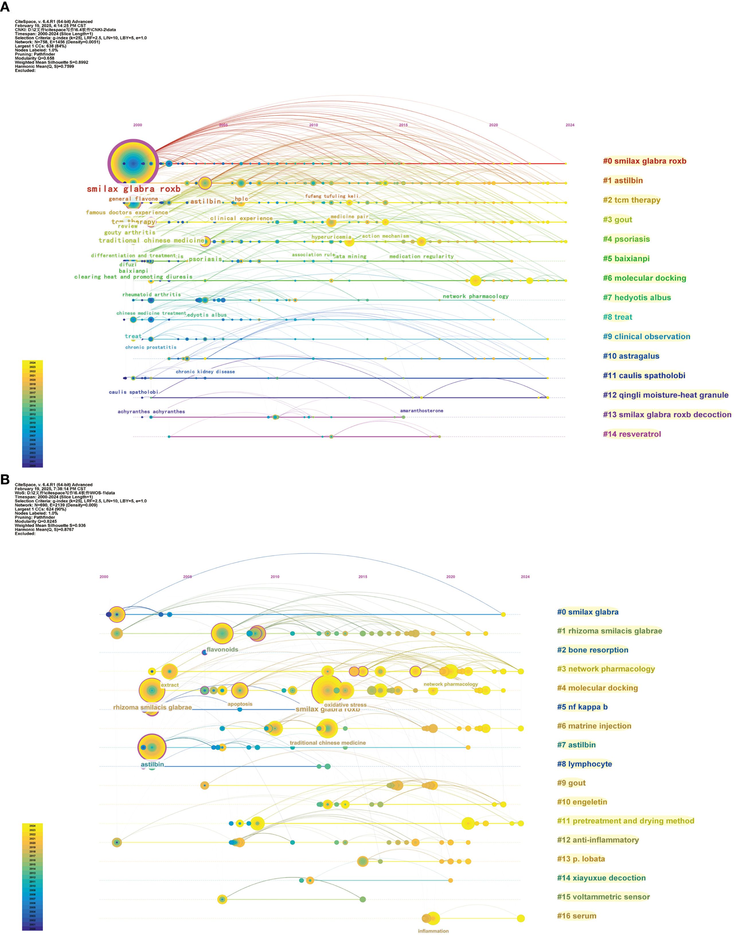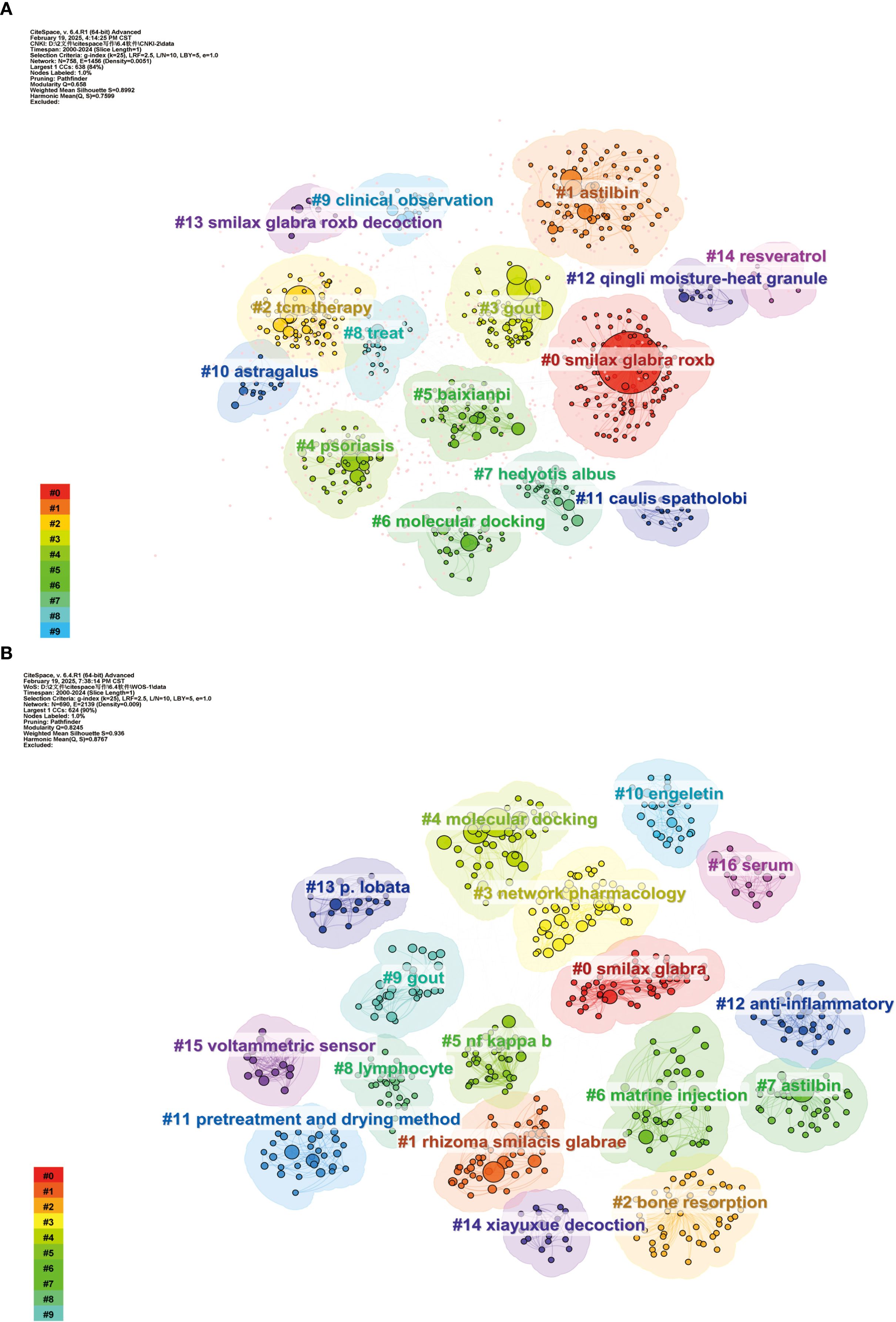 Modularity (Q-value) signifies the importance of the cluster structure within the atlas. Generally, a Q value > 0.3 suggests that the cluster structure is substantial. The Silhouette (S value) assesses the validity of the clustering results; it is widely accepted that an S > 0.7 is generally regarded as indicative of credible clustering results (Chun et al., 2024). This study conducted a cluster analysis on keywords associated with SGR, with results illustrated in Figures 7A, 7B. The Q values for keyword clustering in the Chinese and English literature were 0.658 and 0.8992, respectively. The S values were 0.8245 and 0.936, respectively, signifying that the keyword clustering results of this study were highly reliable. There are 15 clustering labels in the Chinese literature atlas. Research concentrates on pharmacological agents and their chemical constituents (#0 SGR., #1 astibin, #5 baixianpi, #12 qingli moisture-heat granule, #13 SGR.), #14 resveratrol, etc.); disease research (#3 gout, #4 psoriasis); and mechanism research (#6 molecular docking). Seventeen cluster labels were identified in the English literature, predominantly encompassing drugs (#0 smilax glabra, #1 rhizome smilacis glabrae, #6 matrie injection, # 7astilbin, # 10engeletin, etc.). Mechanism research (# 2bone resorption, # 3network pharmacology, # 4 molecular docking, # 5nf kappa b, #16 serum); Disease research (# 9 gout); Method study (#11 pretreatment and drying method).