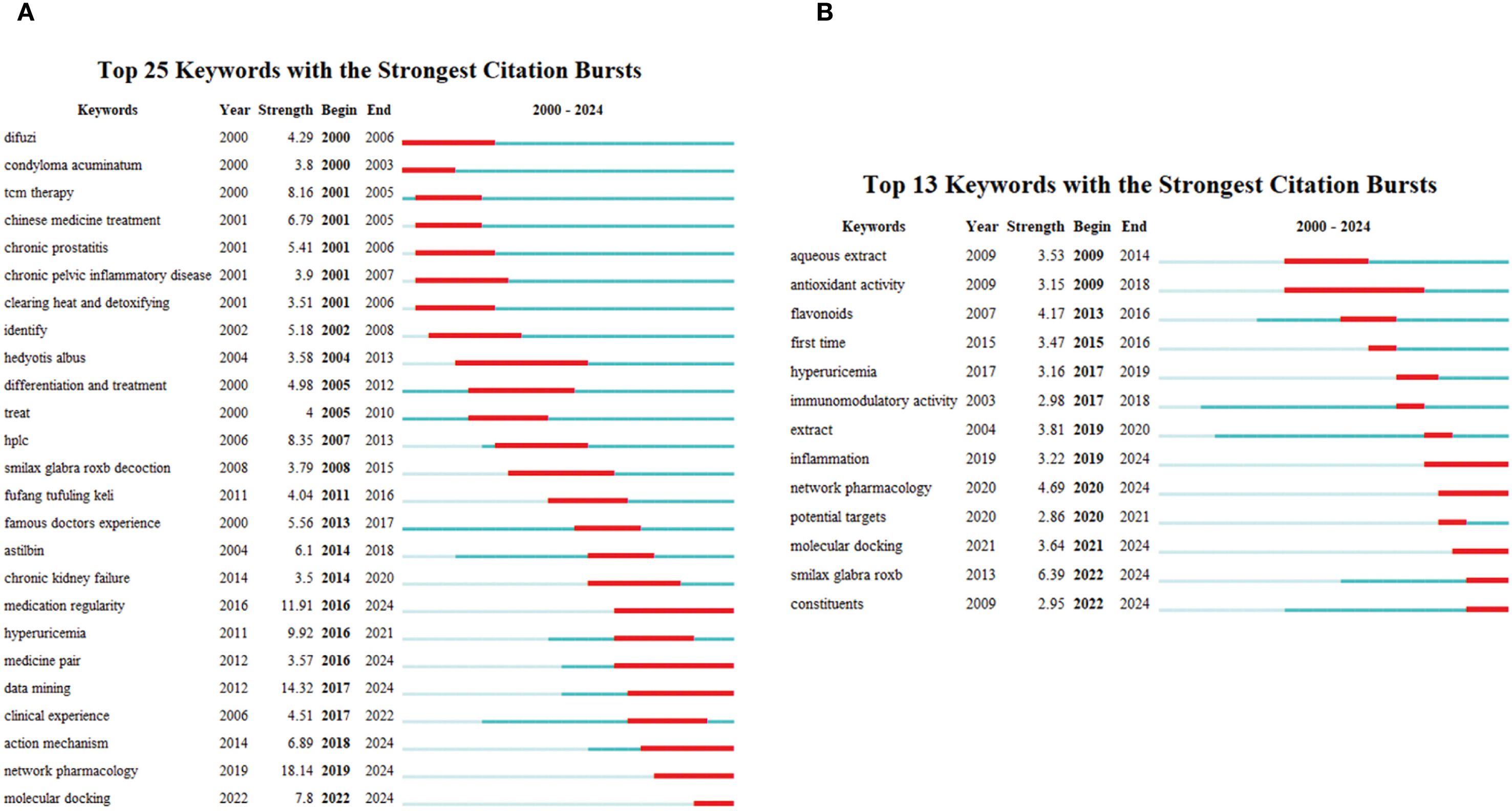 Chronological keyword clustering analysis can be employed to investigate relationships and developmental processes among research hotspots in this domain (Jiahe et al., 2025). Figure 8A, 8B depicts the chronology of keyword clustering. From 2000 to 2024, the clustering tags #0, #1, #2, #3, #4, and #6 in Chinese literature signify that fundamental research on the pharmacodynamic substances of TCM SGR and its application in treating gout and psoriasis has been a prominent research focus. Conversely, the English literature predominantly emphasizes the advancement and refinement of SGR analysis methodologies and pharmacological mechanisms of SGR.