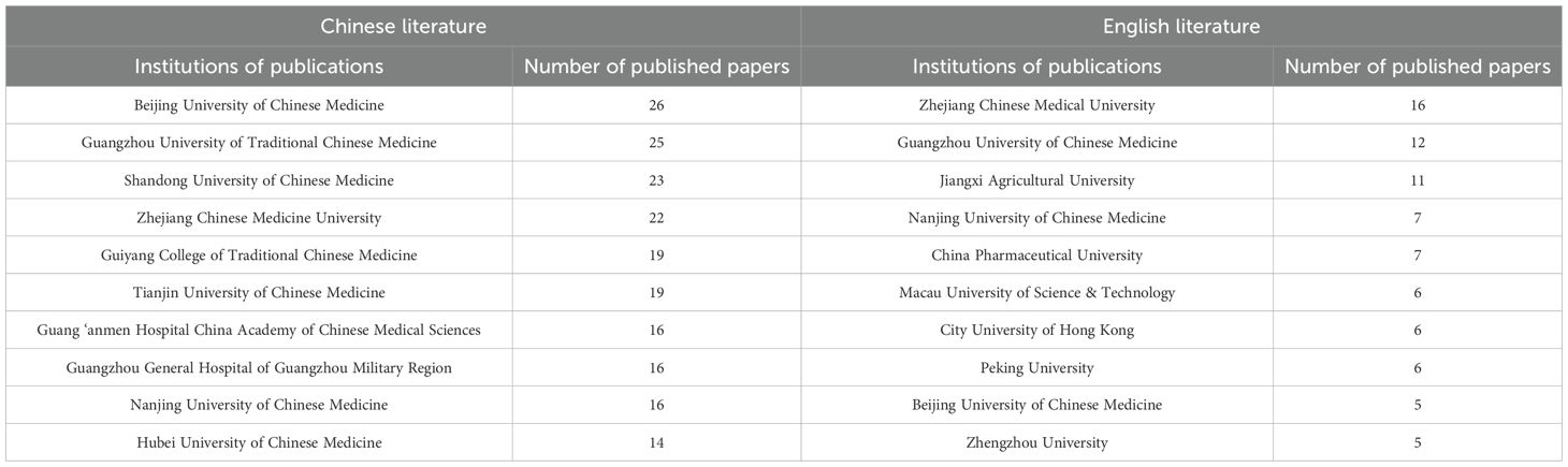 This study involved the analysis of Chinese and English literature pertaining to Traditional TCM. SGR was analyzed by collaborating institutions, resulting in the creation of a co-occurrence atlas of these institutions. Figures 4A, 4B depict the co-occurrence atlas for Chinese and English literature institutions, respectively. Table 2 enumerates the ten leading institutions according to their publication count. The atlas of institutions linked to Chinese literature comprised 481 nodes and 214 connections, yielding a density of 0.0019. Beijing University of Chinese Medicine had the highest publication count, totaling 26 articles. The English literature atlas comprised 162 nodes and 199 links, resulting in a density of 0.0153. Zhejiang Chinese Medical University had the highest number of publications in this category, totaling 16.