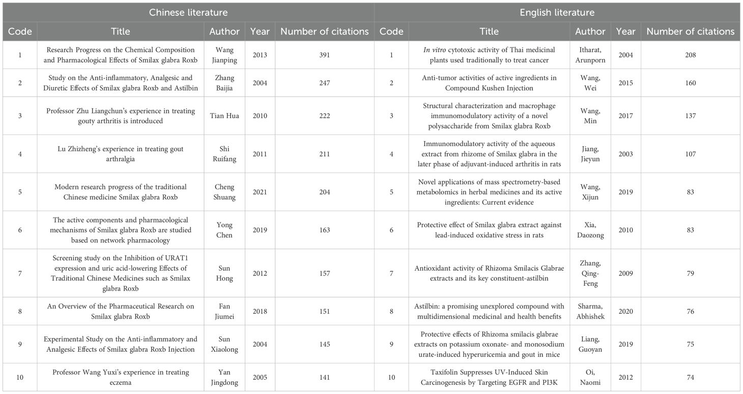 Keyword co-occurrence analysis provides an intuitive overview of principal themes and frequently occurring keywords within a specific research field. The prevalence of these keywords indicates the primary research emphasis and focal points within the field. This investigation identified the prevalent terms in Chinese literature as SGR (677 times), TCM therapy (147 times), and gout (87 times). The predominant terms in English literature were SGR. (59 times), astilbin (40 times), and rhizoma smilacis glabrae (38 times). This paper examines the investigation of SGR and its active components, along with the therapy of gout utilizing SGR and its pharmacological mechanisms.