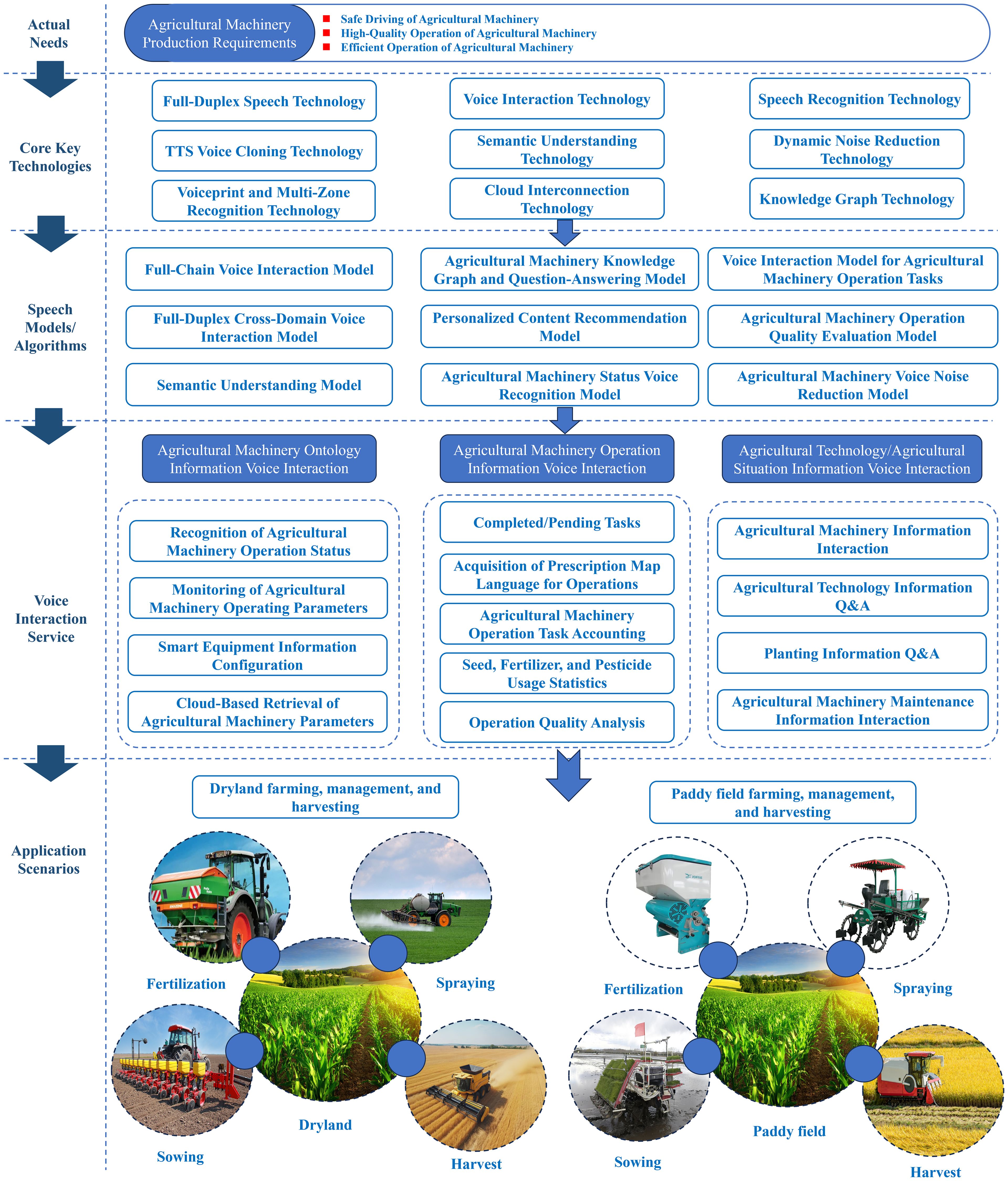 In terms of voice interaction services for agricultural technology and agricultural situation knowledge graphs, technologies such as voiceprint and multi-accent recognition, knowledge graphs, and heuristic question-answering are utilized. By integrating a built-in knowledge base, models like agricultural situation knowledge graph Q&A and personalized content recommendation are established. These enable services such as agricultural situation information interaction, agricultural technology information delivery, and agricultural machinery maintenance information interaction. Based on this information, precise agricultural machinery operations and scheduling can be achieved.