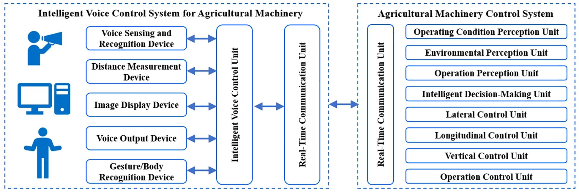Controlling agricultural machinery through a remote controller has the major disadvantage of being inconvenient to carry and operate. Voice-based human-machine interaction is the simplest approach, freeing the operator’s hands and enabling them to perform other tasks simultaneously. In the complex working environment of agricultural machinery operations, the intelligent voice control system must meet the requirements of high real-time performance, high accuracy, and high reliability. When intelligent agricultural machinery performs tasks through voice control, any misrecognition of a voice command could potentially lead to major accidents. A typical intelligent voice control system for agricultural machinery generally consists of functional modules such as voice perception and recognition, distance measurement, voice output, and image display, as well as an intelligent voice control unit and a real-time communication unit (Wanbing et al., 2021), as shown in Figure 2. To enhance human-machine friendliness, the system can also be equipped with gesture/body recognition modules for operators (Lingfei et al., 2022).