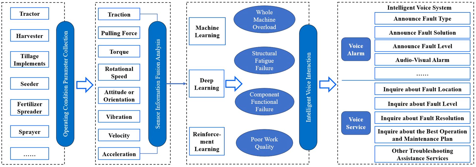 Therefore, the practical application of intelligent voice technology in agricultural machinery fault diagnosis and warning is highly necessary. By accurately integrating new technologies such as advanced materials, intelligent sensing, intelligent measurement and control, the Internet of Things, big data, cloud computing, and artificial intelligence, it is possible to achieve intelligent voice warnings for extreme loads, hazardous conditions, and potential faults under high-speed and heavy-load operations. This holds significant importance for improving the operational reliability and functional reliability of intelligent agricultural machinery.