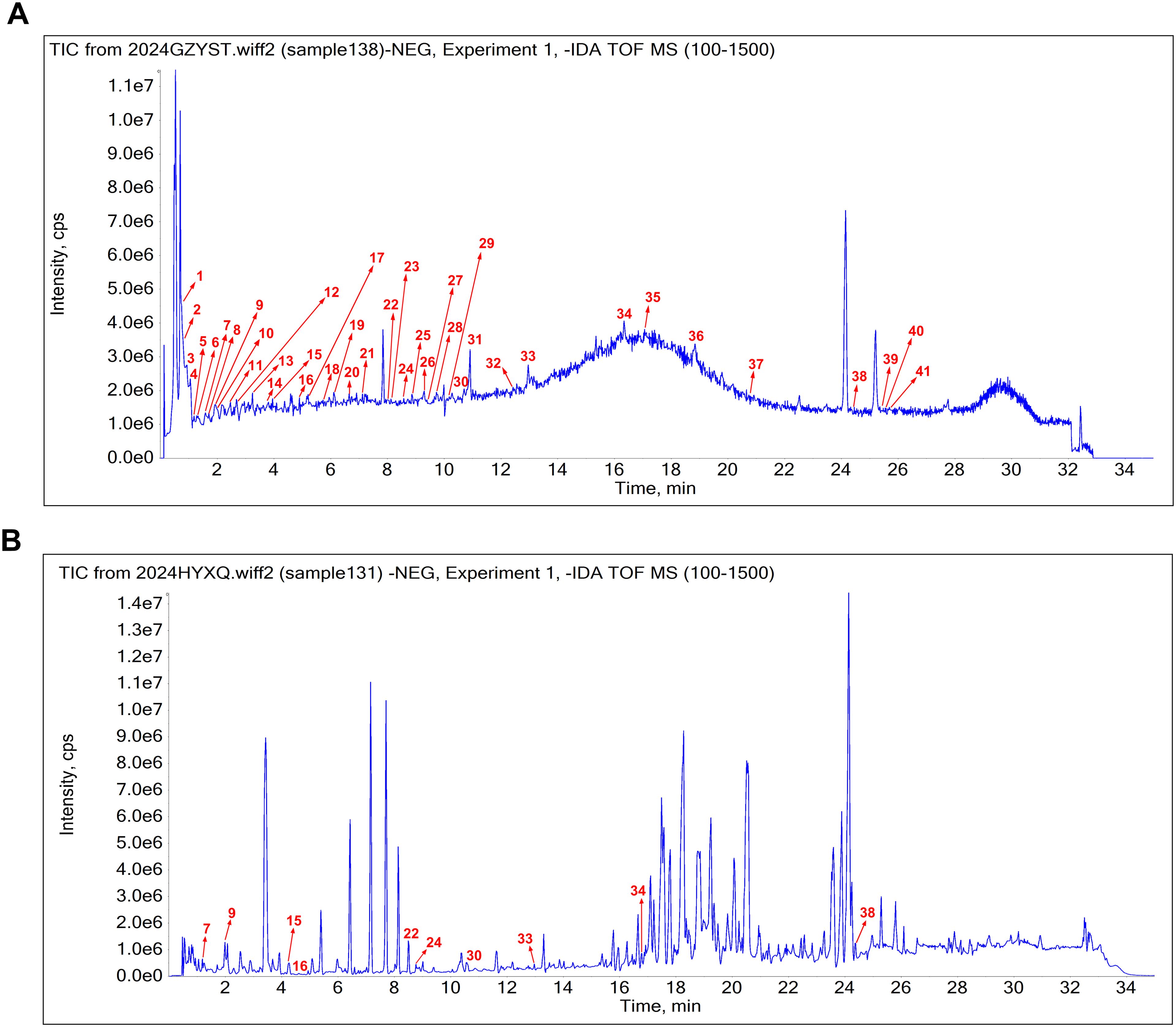 Figure 1. The base peak chromatogram of sugarcane leaf extract. (A) Phytochemical constituents identified in sugarcane leaf extract under negative ion mode. (B) Absorbed prototype constituents identified in serum.