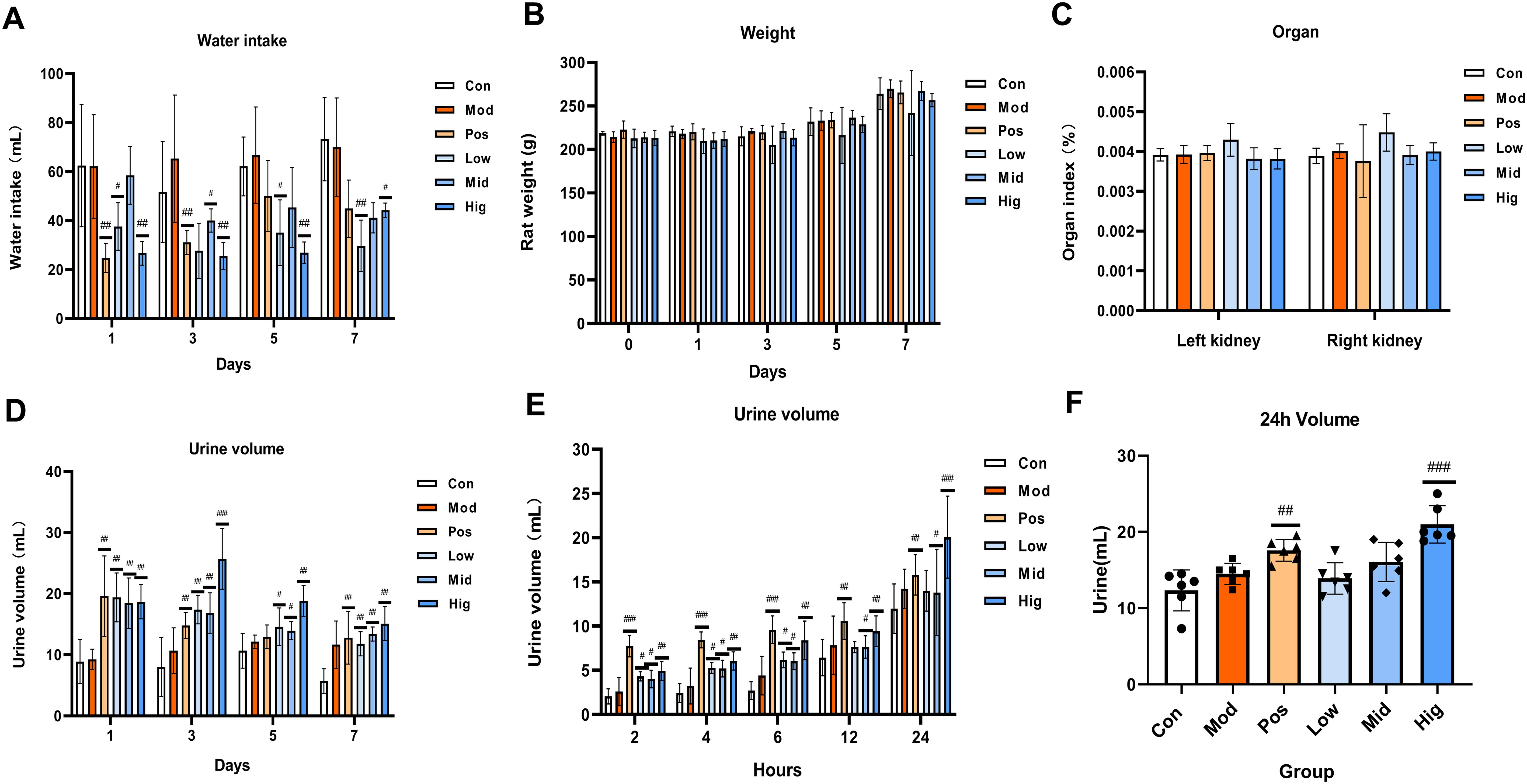 Prior to the final drug administration, all animals were fasted for 12 h with ad libitum water access. Following suprapubic compression to empty bladder residual urine, rats received 25 mL/kg 0.9% NaCl via oral gavage to establish the water-loading model. After 30 min, the model group and treatment groups received their respective drug solutions via oral gavage and were then transferred to metabolic cages. Urine was collected at 1, 2, 4, 6, 12, and 24 h for the detection of urinary indicators. After 24 h, rats were anesthetized by intraperitoneal injection of 10% chloral hydrate. Blood was collected via abdominal aorta, allowed to clot for 1 hour at room temperature, and then centrifuged at 13,000 rpm for 15 min to isolate serum. Throughout the treatment period, daily observations included mental state, food intake, spontaneous activity, and coat condition. Body weight, water intake, and urine output were measured on days 0, 1, 3, 5, and 7 before treatment.