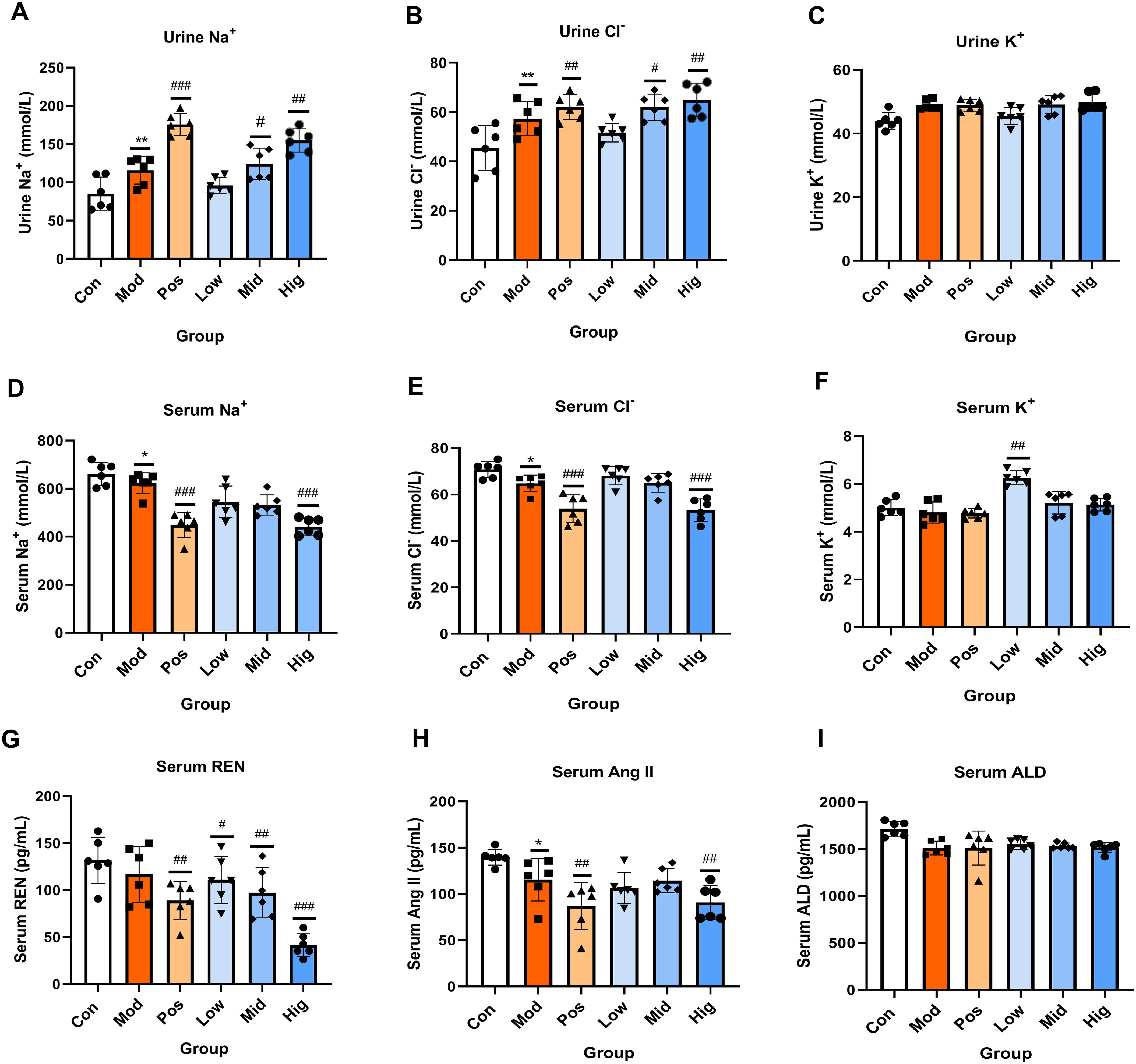 Figure 3. Effects of sugarcane leaf extract on the trends of Na+, Cl-, K+ electrolyte changes in rat urine and serum, as well as on the renin-angiotensin-aldosterone system. (A-F) Comparative analysis of Na+, Cl-, K+ in urine and serum. (G-I) Expression levels of REN, Ang II, and ALD in the renin-angiotensin-aldosterone system in the serum of rats from each group. Compared with the model group, n = 6, #P < 0.05, ##P < 0.01, ###P < 0.001; compared with the blank control group, *P < 0.05, **P < 0.01. Ordinary One-way ANOVA. Values are expressed as mean ± SEM. Theexperiment was divided into six groups: blank control (Con), model (Mod), positive control (Pos), low-dose sugarcane leaf extract (Low), middle-dose sugarcane leaf extract (Mid), and high-dose sugarcane leaf extract (Hig).