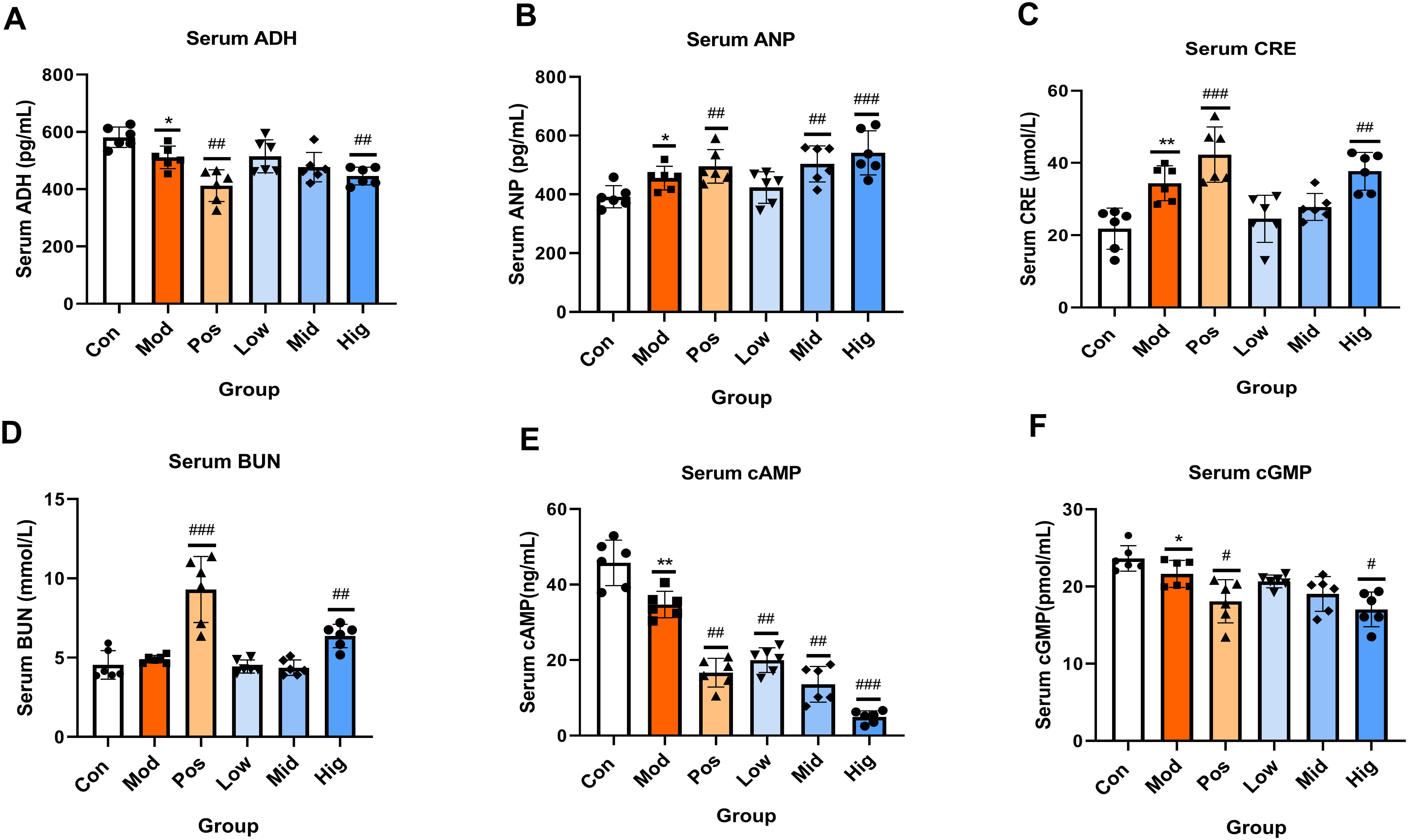 Figure 4. Effects of sugarcane leaf extract on antidiuretic hormone (ADH), atrial natriuretic peptide (ANP), creatinine (CRE), blood urea nitrogen (BUN), cyclic adenosine monophosphate (cAMP), and cyclic guanosine monophosphate (cGMP) in rat serum. Compared with the model group, n = 6, #P < 0.05, ##P < 0.01, ###P < 0.001; compared with the blank control group, *P < 0.05, **P < 0.01. Ordinary One-way ANOVA. Values are expressed as mean ± SEM. Theexperiment was divided into six groups: blank control (Con), model (Mod), positive control (Pos), low-dose sugarcane leaf extract (Low), middle-dose sugarcane leaf extract (Mid), and high-dose sugarcane leaf extract (Hig).