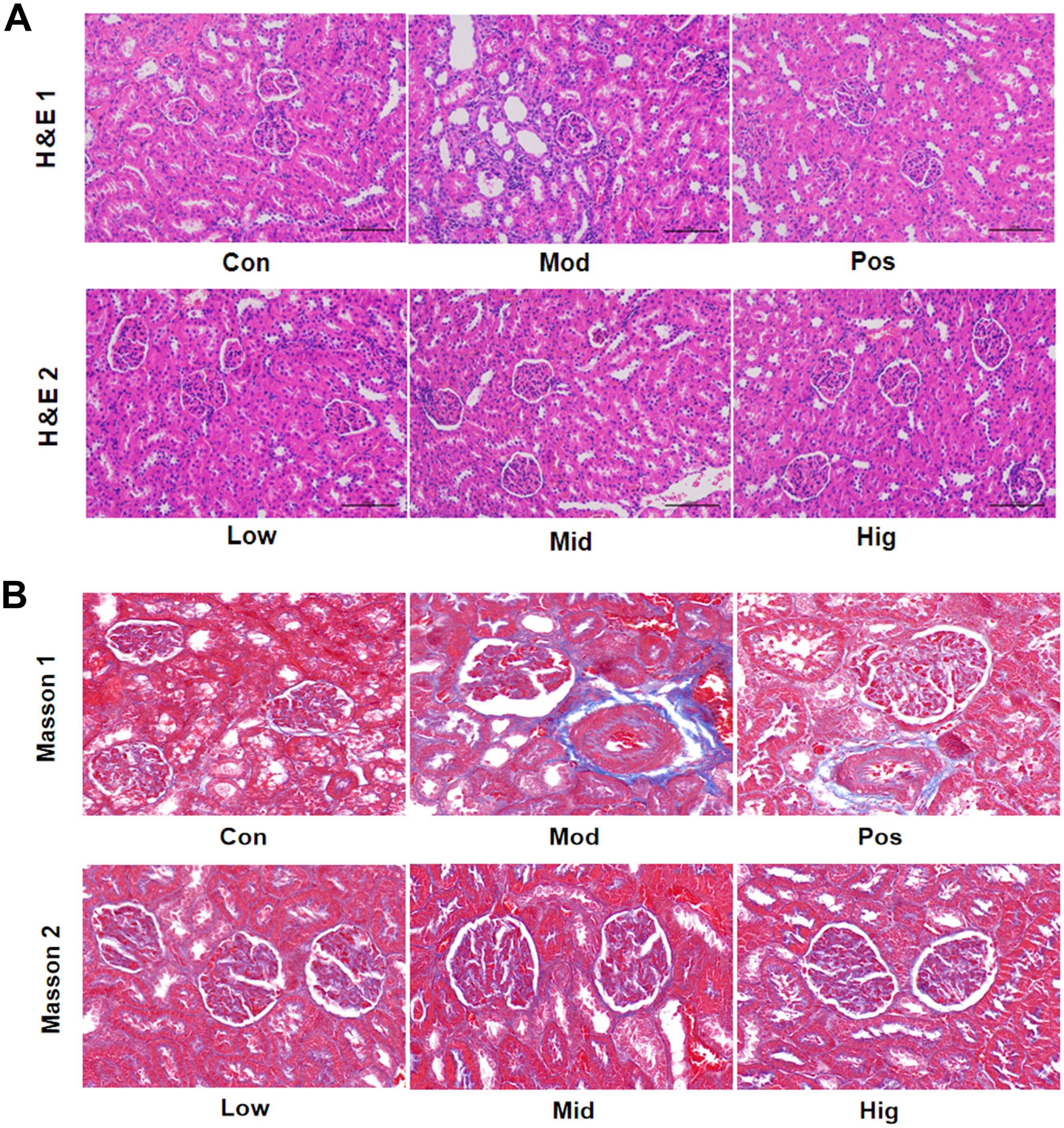 Following completion of drug treatment, the rats were anesthetized with 10% chloral hydrate. Bilateral kidneys were excised, weighed, and perfused with ice-cold saline to remove blood residues. The tissues were then fixed in 4% paraformaldehyde solution for 24 h. After fixation, tissues were processed through graded ethanol dehydration, embedded in paraffin, and sectioned. Sections were stained with hematoxylin and eosin (H&E) for histology evaluation and with Masson’s trichrome for fibrosis assessment. Renal cortical morphology was examined under a light microscope.