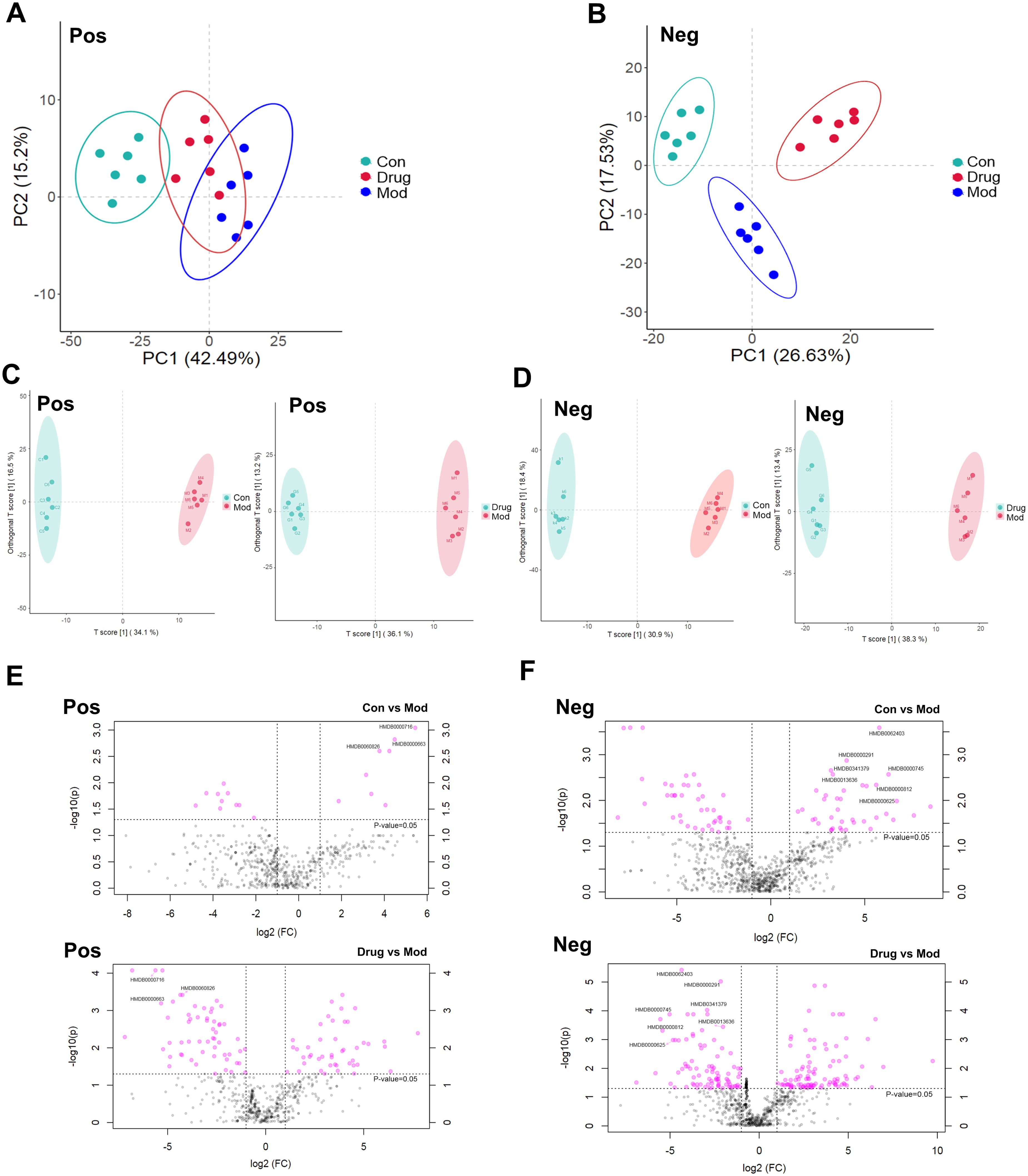 Figure 6. Scores of PCA, OPLS–DA, and differential volcano plots of rat urine samples. (A) PCA analysis in positive ion mode. (B) PCA analysis in negative ion mode. (C) OPLS–DA analysis in positive ion mode. (D) OPLS–DA analysis in negative ion mode. (E) Distribution of differential metabolites in positive ion mode. (F) Distribution of differential metabolites in negative ion mode.
