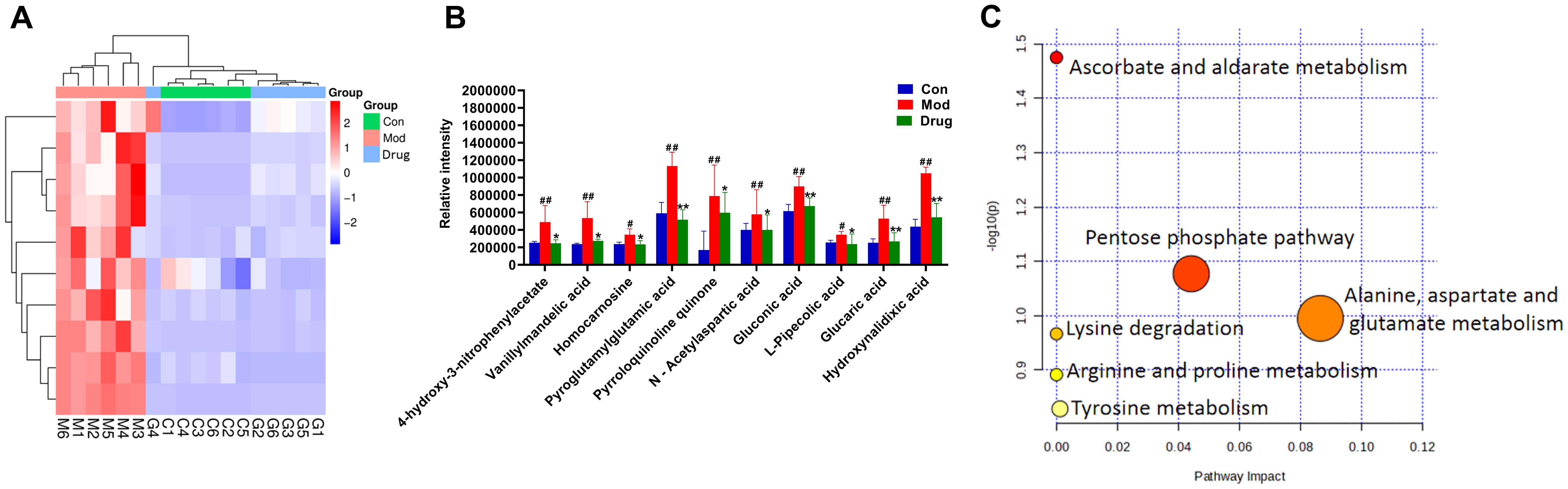 Figure 7. Expression levels of endogenous differential metabolic biomarkers and enrichment analysis of metabolic pathways. (A) Heatmap showing the expression levels of differential metabolites in different groups. (B) Bar chart representing the changes in the relative intensity of differential metabolites in different groups. (C) Pathway enrichment analysis of differential metabolites. Compared with the blank control group, # P < 0.05, ## P < 0.01; compared with the model group, * P < 0.05, ** P < 0.01, mean ± SEM.