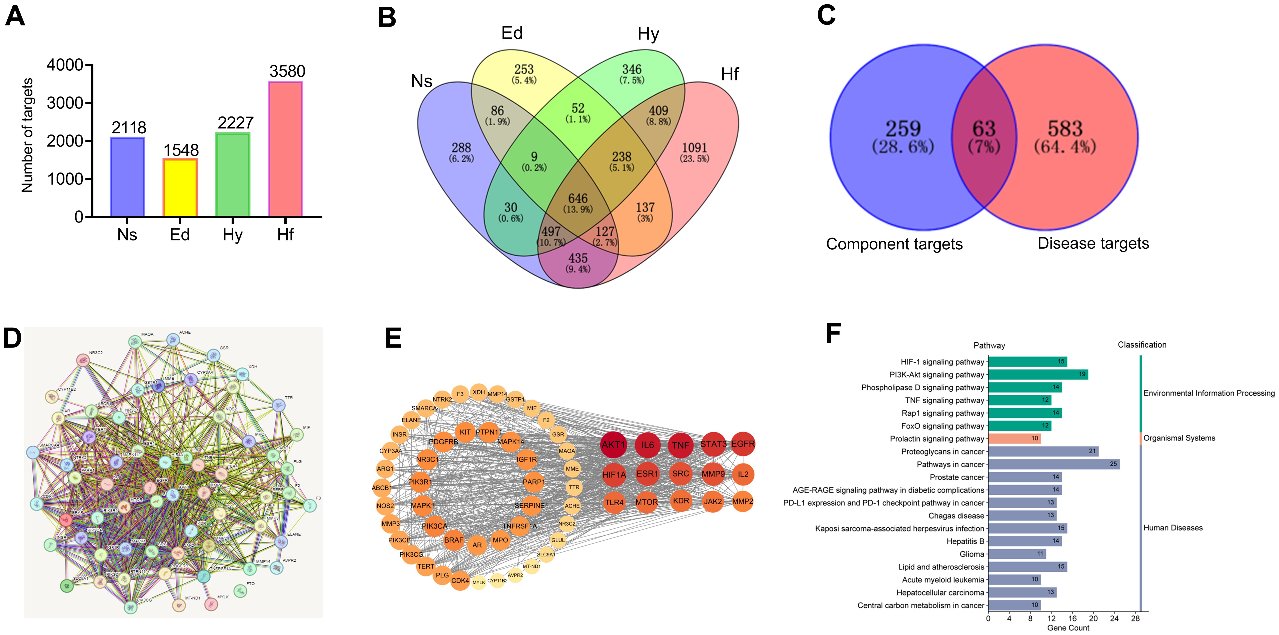 Potential targets of sugarcane leaf absorbed components were identified using Swiss Target Prediction (http://www.swisstargetprediction.ch/) and SEA (Similarity Ensemble Approach) (https://sea.bkslab.org/) databases, with species restricted to “Homo sapiens”. Disease-related targets were retrieved from GeneCards (https://www.genecards.org/), OMIM (https://www.omim.org/), and DisGeNET (https://www.disgenet.org/search) using the search keywords: “Edema, Ed”, “Hypertension, Hy”, “Heart failure, Hf” and “Nephrotic syndrome, Ns”. Duplicate targets were removed and overlapping targets between compounds and diseases were identified using Venny 2.1.0 (http://www.liuxiaoyuyuan.cn/). These common targets were considered potential mediators of the diuretic effects of sugarcane leaf extract. Venn diagrams were generated to visualize the overlap between compound and disease targets.