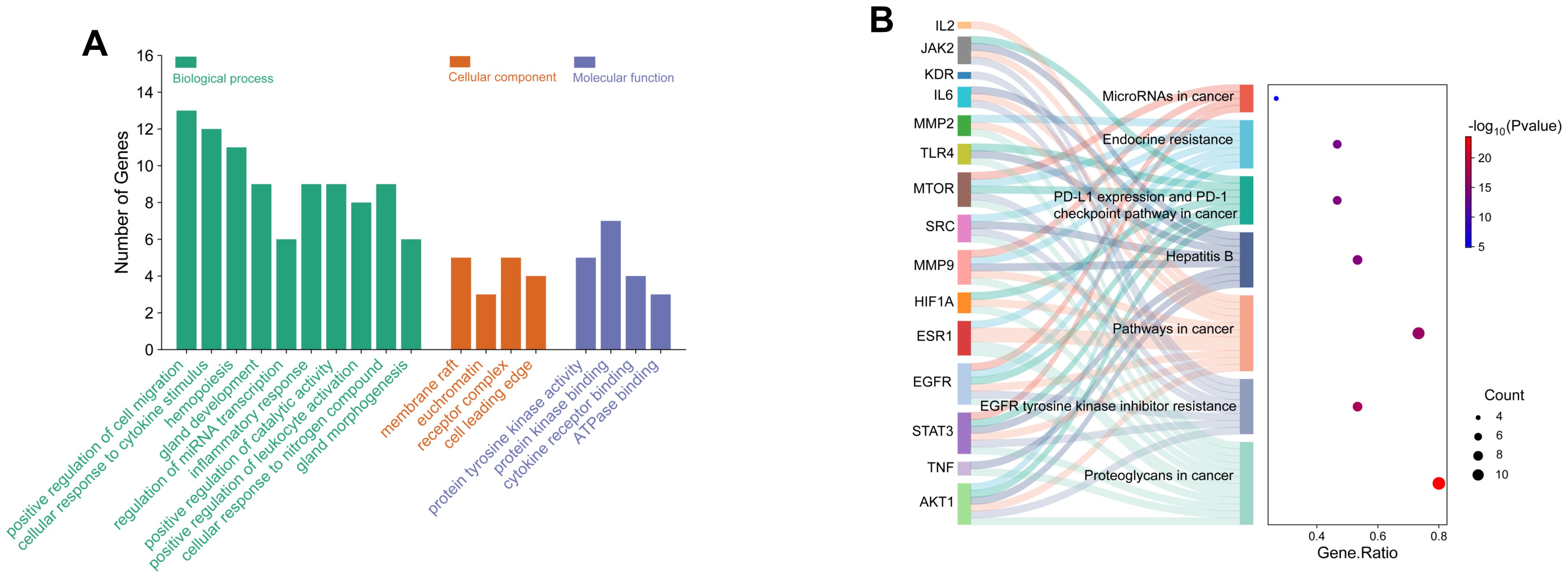 Figure 9. GO and KEGG pathway enrichment analysis of key targets. (A) GO analysis of biological processes, cellular components, and molecular functions of key targets. (B) KEGG pathway enrichment analysis of key targets using the enrichment Sankey diagram.