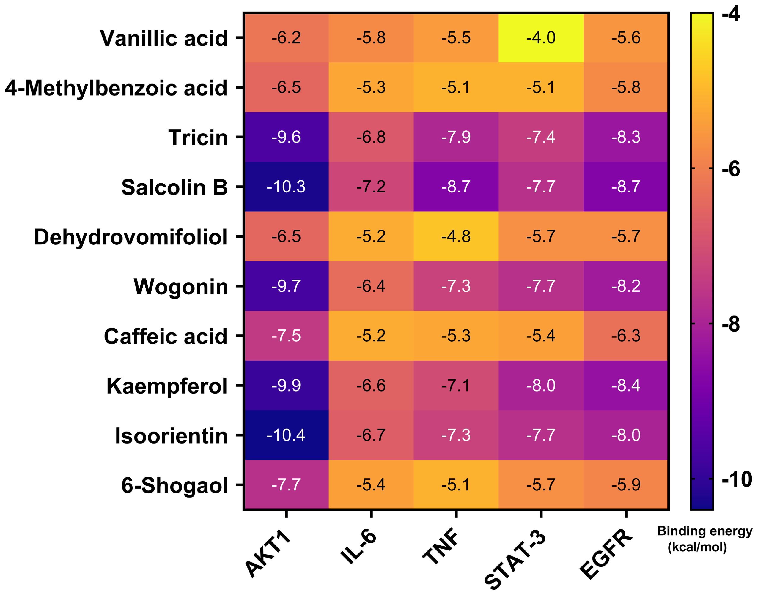 Figure 10. Molecular docking of the 10 blood components in sugarcane leaf extract with 5 key targets, with binding energies represented by a heatmap. The color intensity indicates the magnitude of the absolute value of the binding energy; the darker the color, the greater the absolute value of the binding energy, and the stronger the binding interaction.