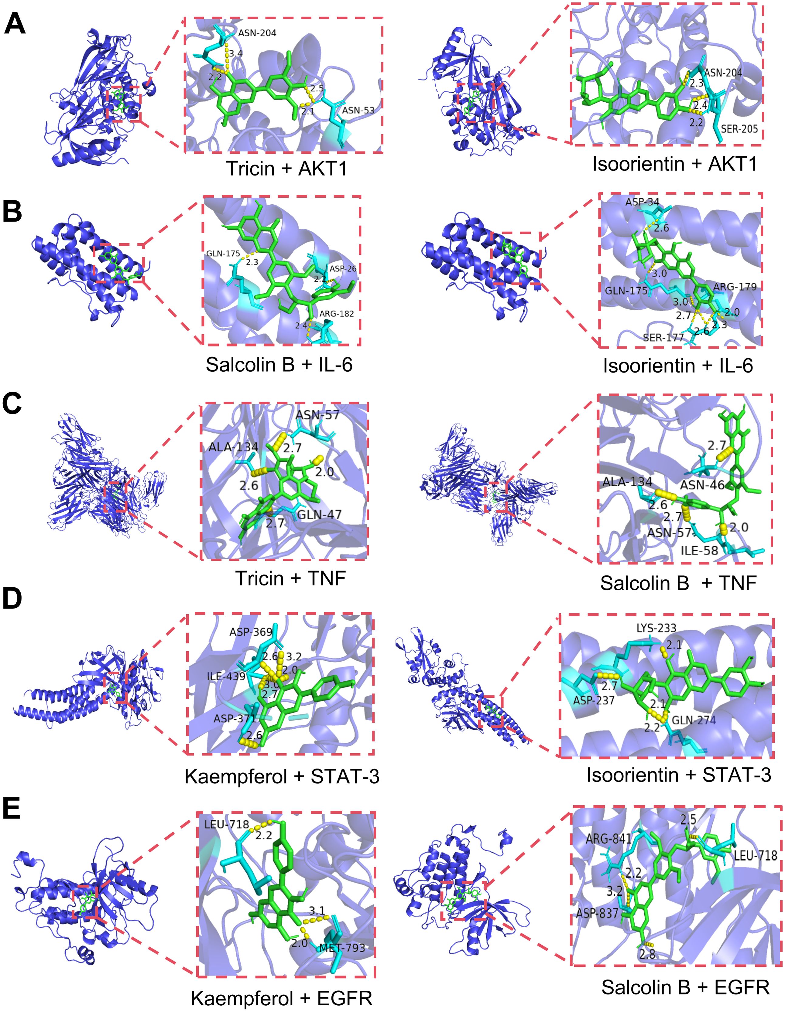 Figure 11. Visualization of molecular docking combinations with strong binding interactions. (A) Molecular docking of tricin, isoorientin with AKT1. (B) Molecular docking of salcolin B, isoorientin with IL-6. (C) Molecular docking of tricin, salcolin B with TNF. (D) Molecular docking of kaempferol, isoorientin with STAT-3. (E) Molecular docking of kaempferol, salcolin B with EGFR.