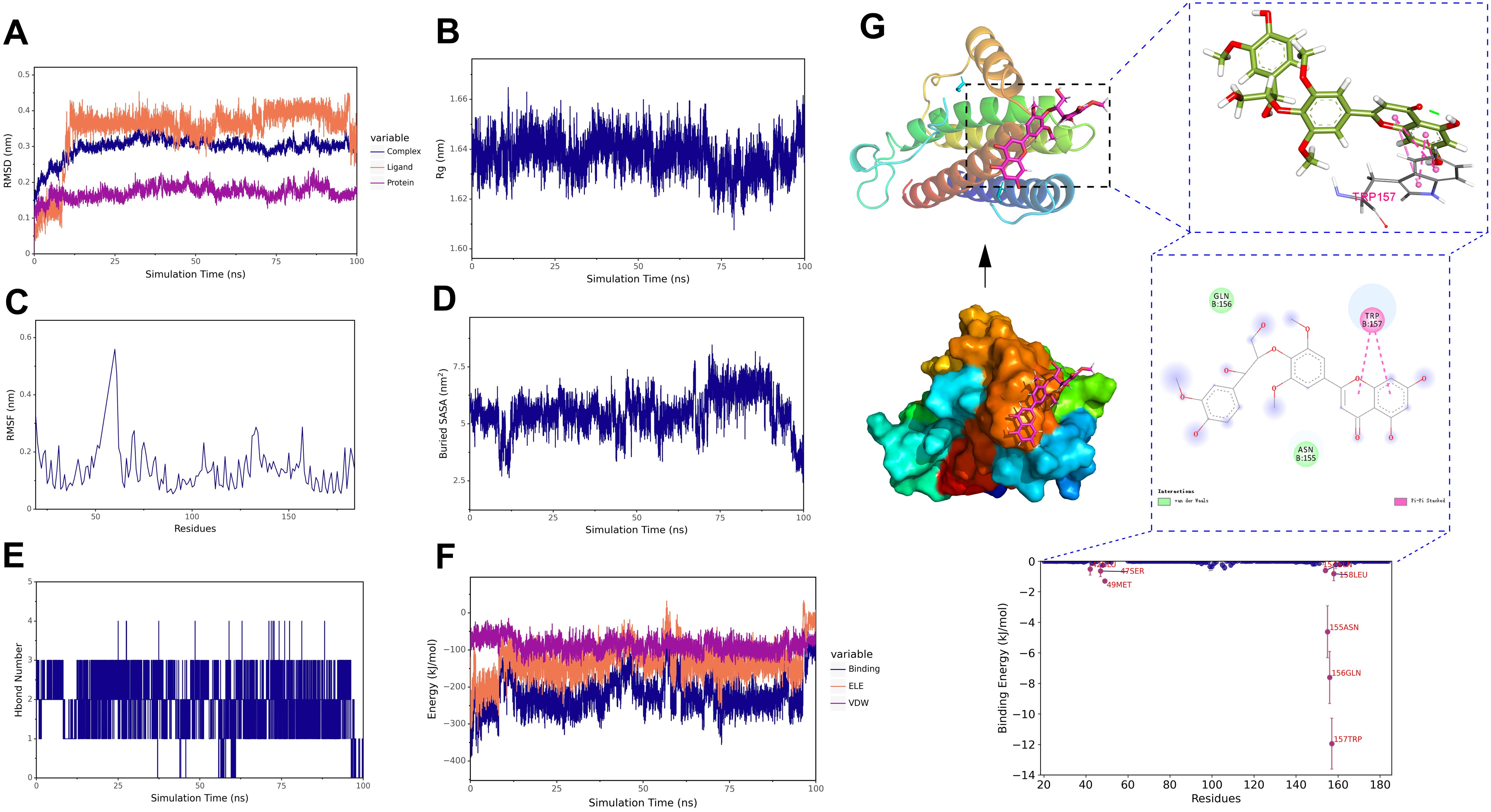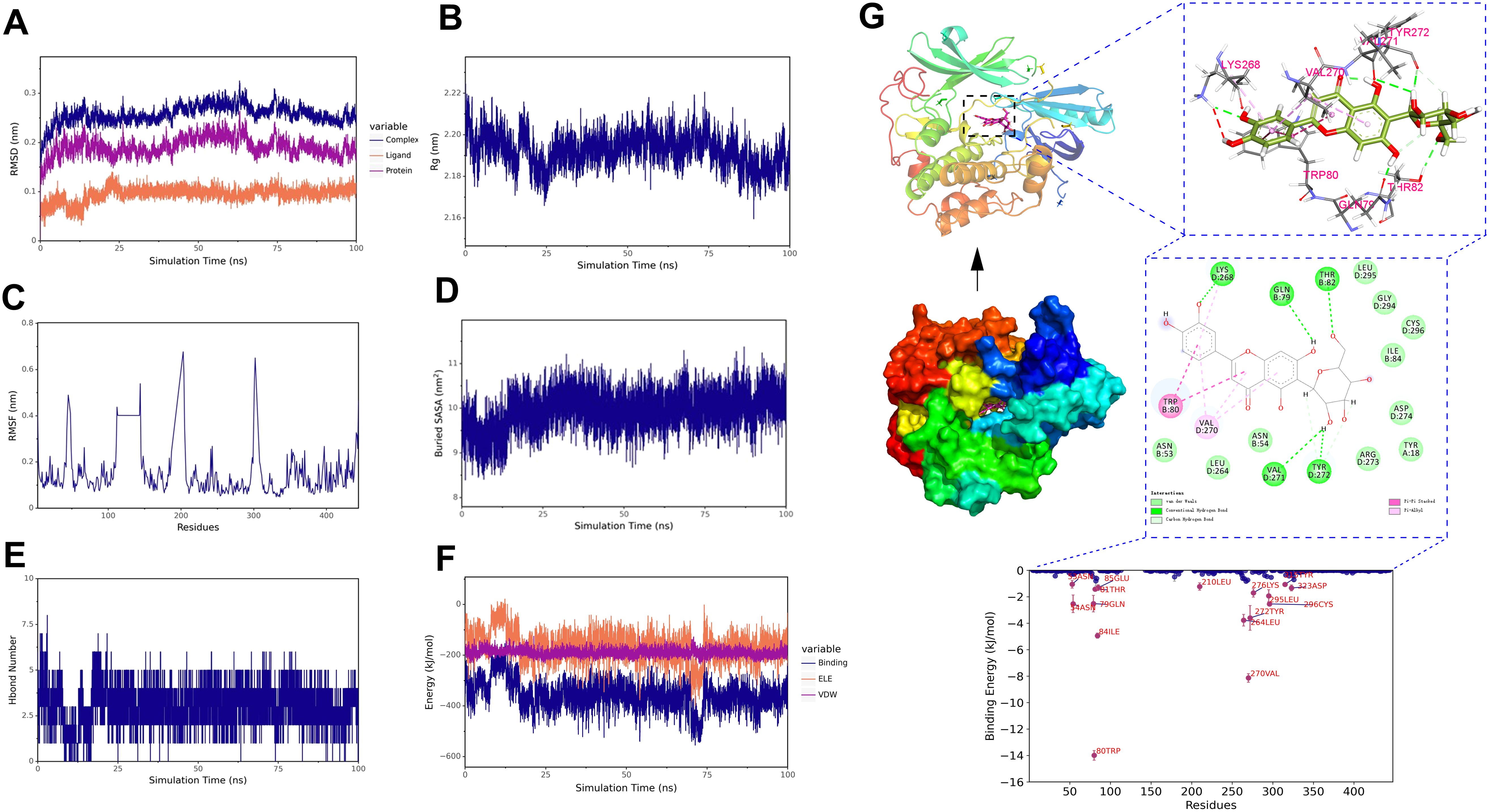 Figure 12. Molecular dynamics simulation of the isoorientin-AKT1 complex. (A) RMSD of the complex, protein, and small molecule ligand. (B) Rg of the complex. (C) RMSF of the protein in the complex. (D) Buried SASA between the small molecule and the protein. (E) Number of hydrogen bonds (Hbond number). (F) Binding energy (VDW and ELE) between the small molecule and the protein. (G) Structural and interaction analysis of isoorientin and AKT1.
