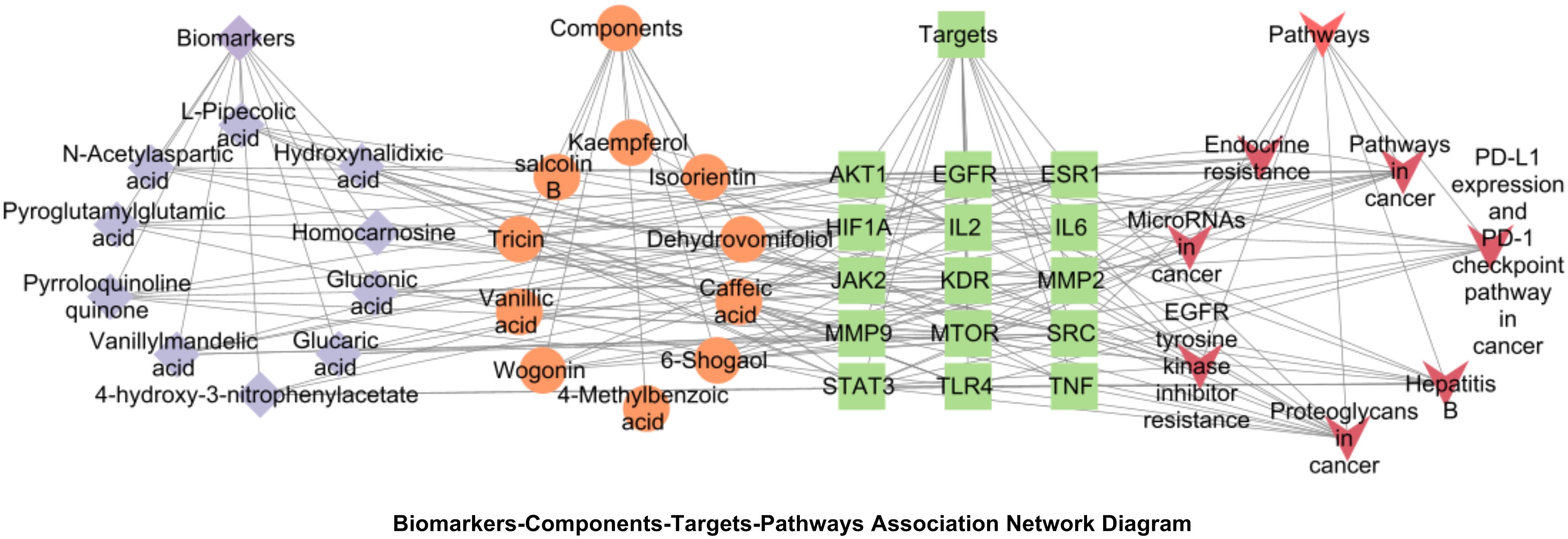 Figure 14. Biomarkers-components-targets-pathways network diagram of the diuretic effect of sugarcane leaf extract. Blue diamonds represent biomarkers, orange circles represent components, green squares represent key targets, and red triangles represent pathways.
