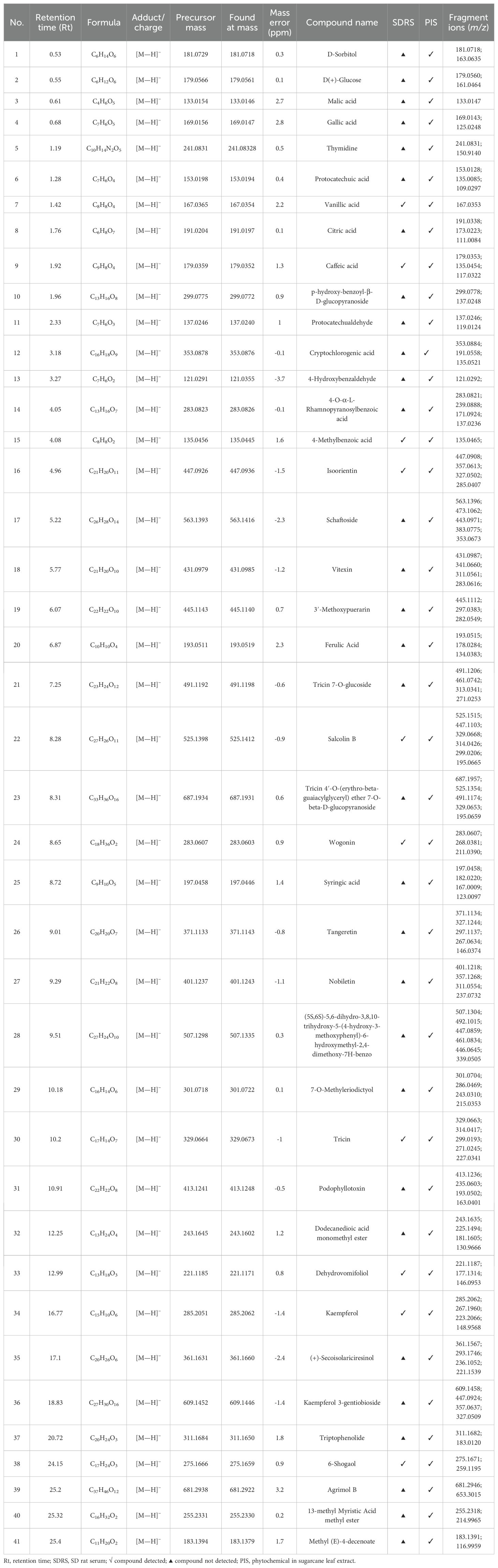 Phytochemical constituents in sugarcane leaf extract were analyzed by UPLC–MS. The total ion current chromatogram of sugarcane leaf extract is shown in Figure 1A. Of 41 phytochemical constituents identified in the negative ion mode, 10 prototype chemical constituents were detected in rat serum (Figure 1B). Compounds were characterized through MS/MS spectral interpretation and literature comparison. Identified compounds comprised flavonoids, organic acids, phenols, terpenoids, and saccharides (Table 1).