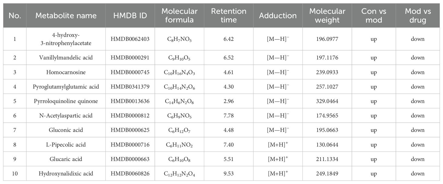 On the final experimental day, urine samples from all groups were collected, centrifuged at 13,000 rpm for 15 min at 4°C, and the supernatants stored at -80°C. Prior to analysis, samples were thawed to room temperature. A volume of 200 μL of urine sample was transferred to a 1.5 mL centrifuge tube, followed by the addition of 800 μL of ultrapure water. The mixture was vortexed for 1 minute and centrifuged at 13,000 rpm for 15 min. The supernatant was filtered (0.22 μm) for UPLC–MS analysis. Pooled serum was from the Hig group, and 1 mL was transferred into 5 mL EP tubes. Three times the volume of methanol-acetonitrile (2:1, v/v) was added to precipitate proteins. The mixture was vortexed for 3 min and then centrifuged at 13,000 rpm for 8 min at 4°C. The supernatant was filtered through a 0.22 μm microporous membrane and concentrated to dryness using a vacuum freeze-dryer. The residue was reconstituted in 200 μL of 50% methanol by ultrasonication for 30 min, then centrifuged at 13,000 rpm for 15 min at 4°C. The cleared supernatant was analyzed by UPLC–MS. Serum samples from the blank group were processed using the same protocol.