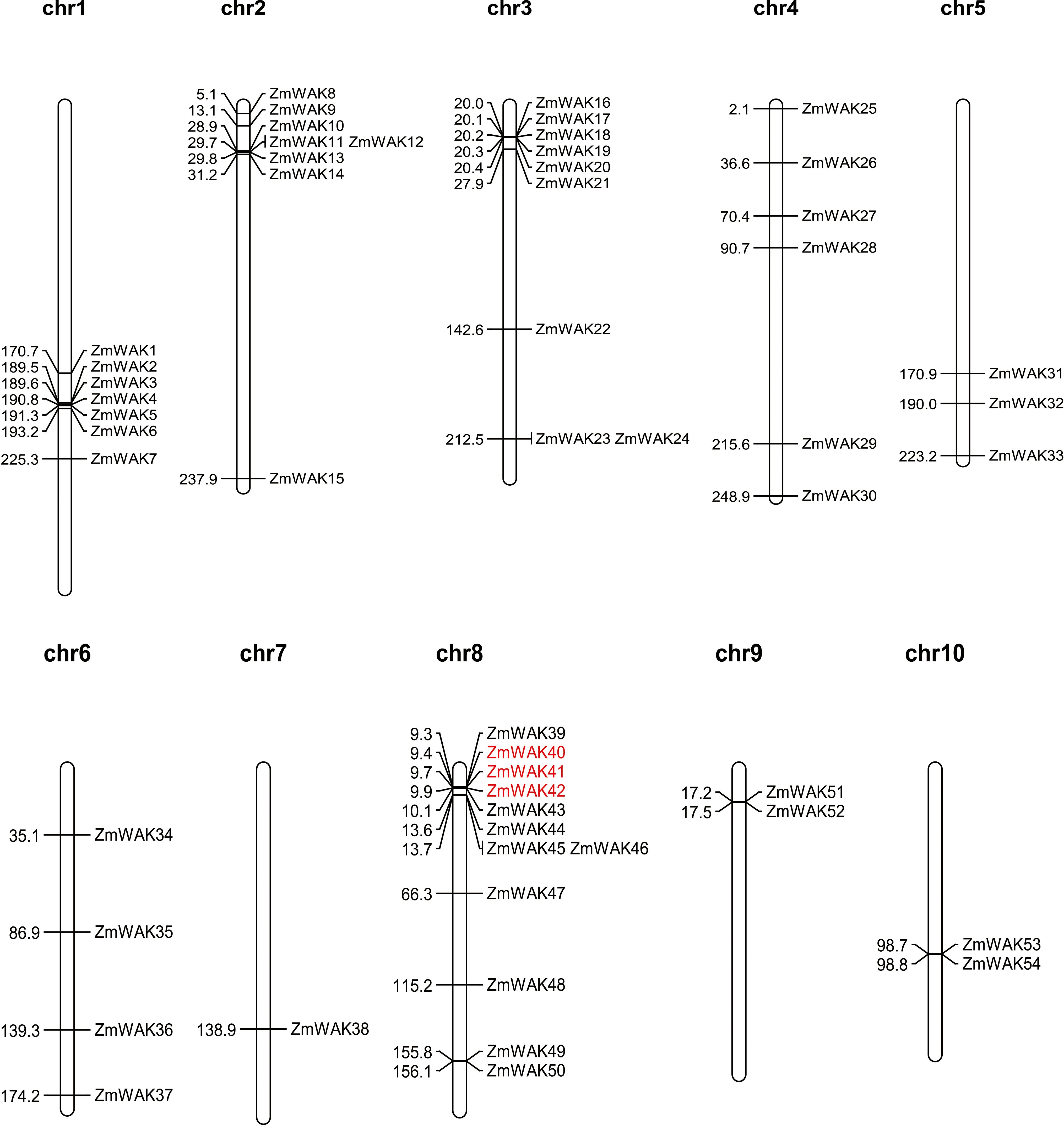 Figure 2. Distribution of ZmWAKs in maize genome. Red color represents these genes underwent tandem duplication.