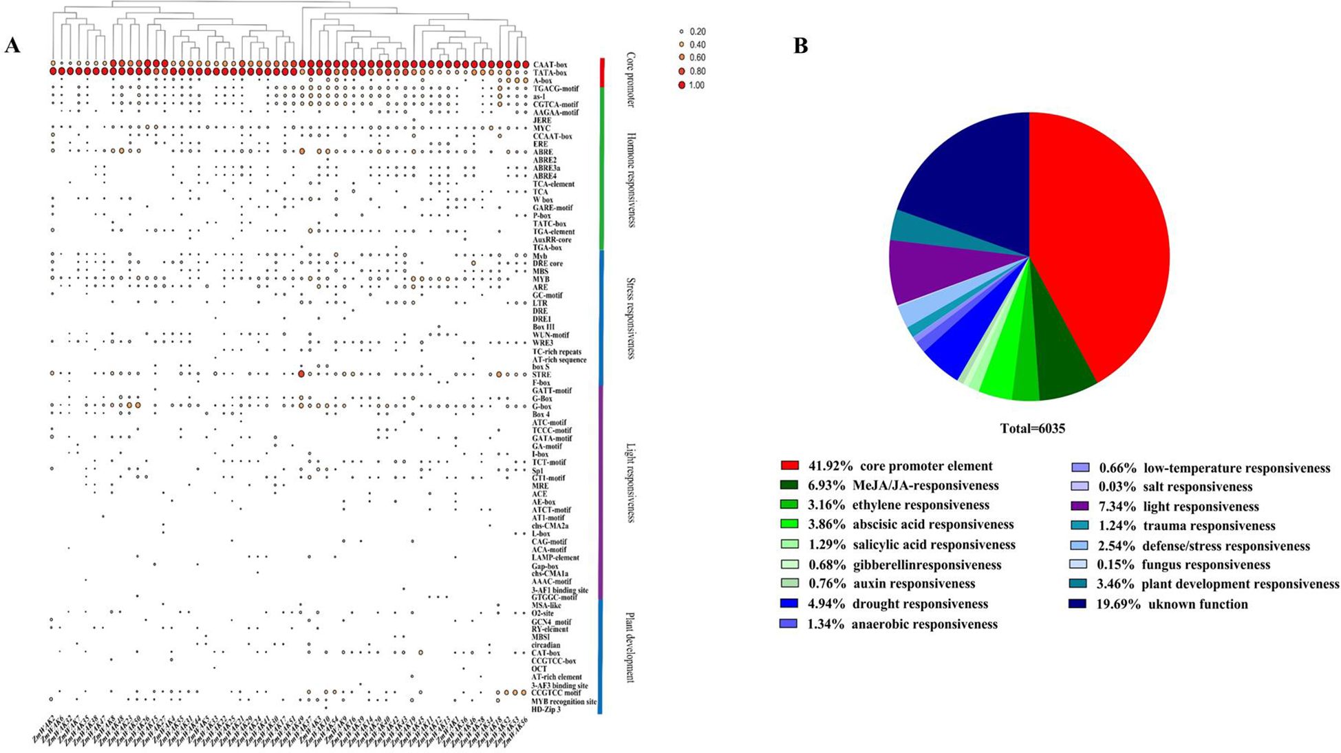 Figure 5. Predicted cis-elements in promoter regions of ZmWAK genes. (A) Distribution of different cis-regulatory elements. (B) The relative proportion of various cis-elements within promoter regions.