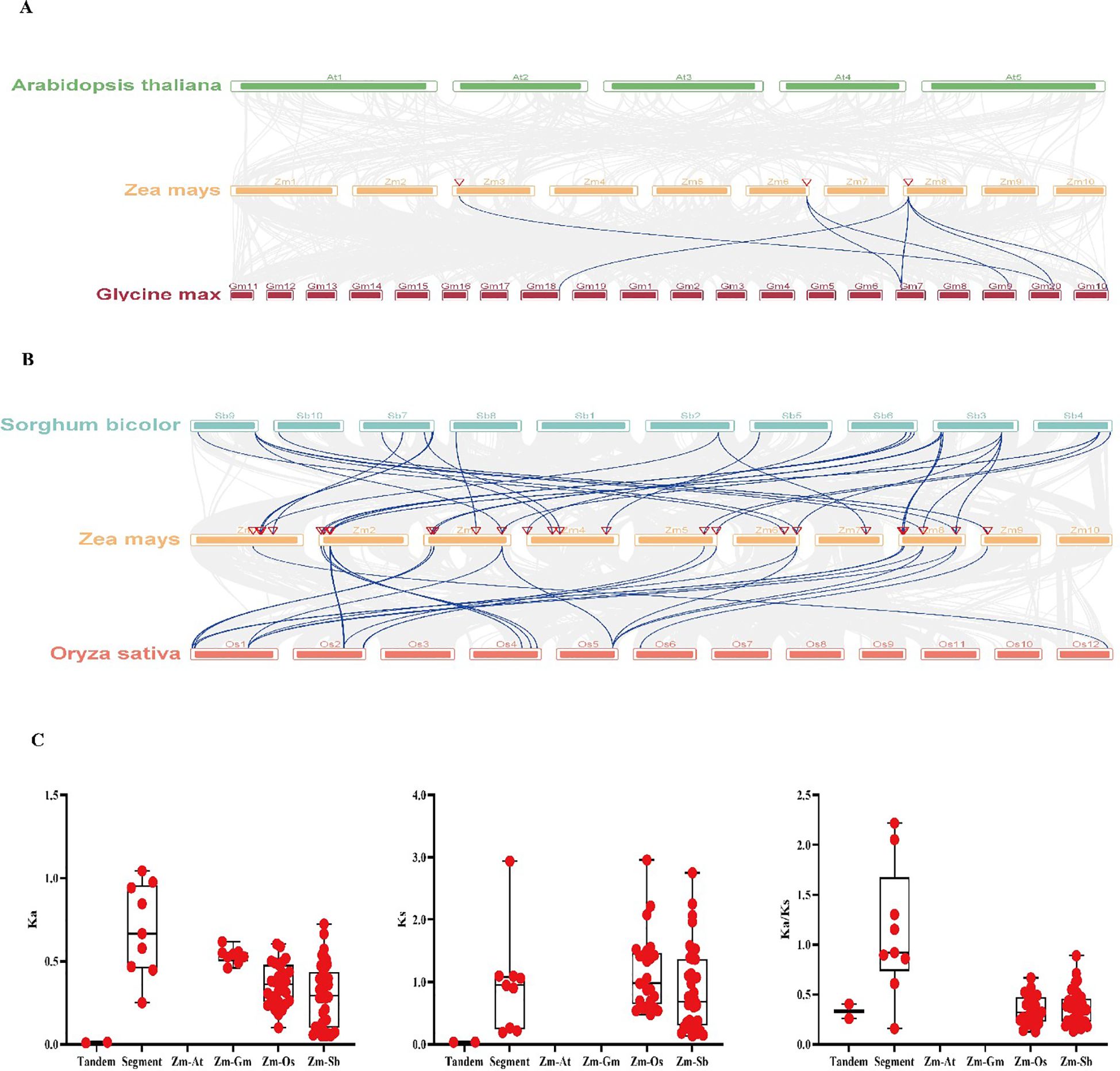 Figure 6. Gene duplication and collinearity of the WAK genes in maize. (A) The collinearity analysis of WAK genes among maize, Arabidopsis and soybean. (B) The collinearity analysis of WAK genes among maize, rice and sorghum. (C) The tandem repeats, segment repeats, and repeats among maize, Arabidopsis (Zm-At), soybean (Zm-Gm), rice (Zm-Os) and sorghum (Zm-Sb), respectively.
